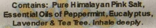 - Ingredients: Himalayan Pink Salt, Oils of Peppermint, Eucalyptus, Lavender and Tea Tree.