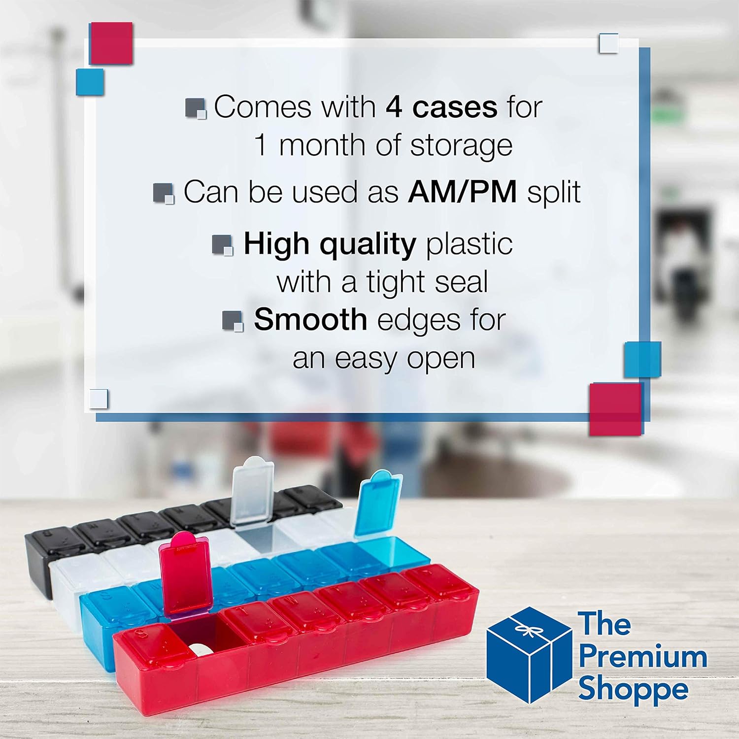 USA Merchant - 7 Day Small Pill Box with Snap Close Lids - Weekly Pill Organizer 4 Times a Day or 28 Day Dispenser - Comes with 4 Separate 7 Day Pill Containers for Vitamins, Supplements, and Medicine