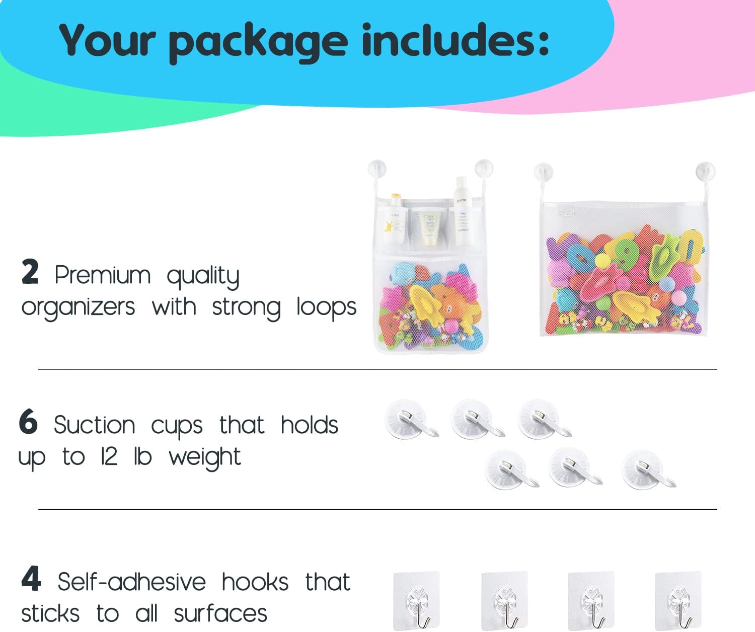 - CONCRETE SUCTION CUPS: Unlike some of the other bathroom organizer nets, we include 6 super strong suction cups instead of just 4. Our suction cups 'lock" once you move the hook down which means your bath storage net will stay stuck to the wall without constantly falling off!To ensure the BEST SUCTION possible, please just make sure the surface is FLAT and EVEN