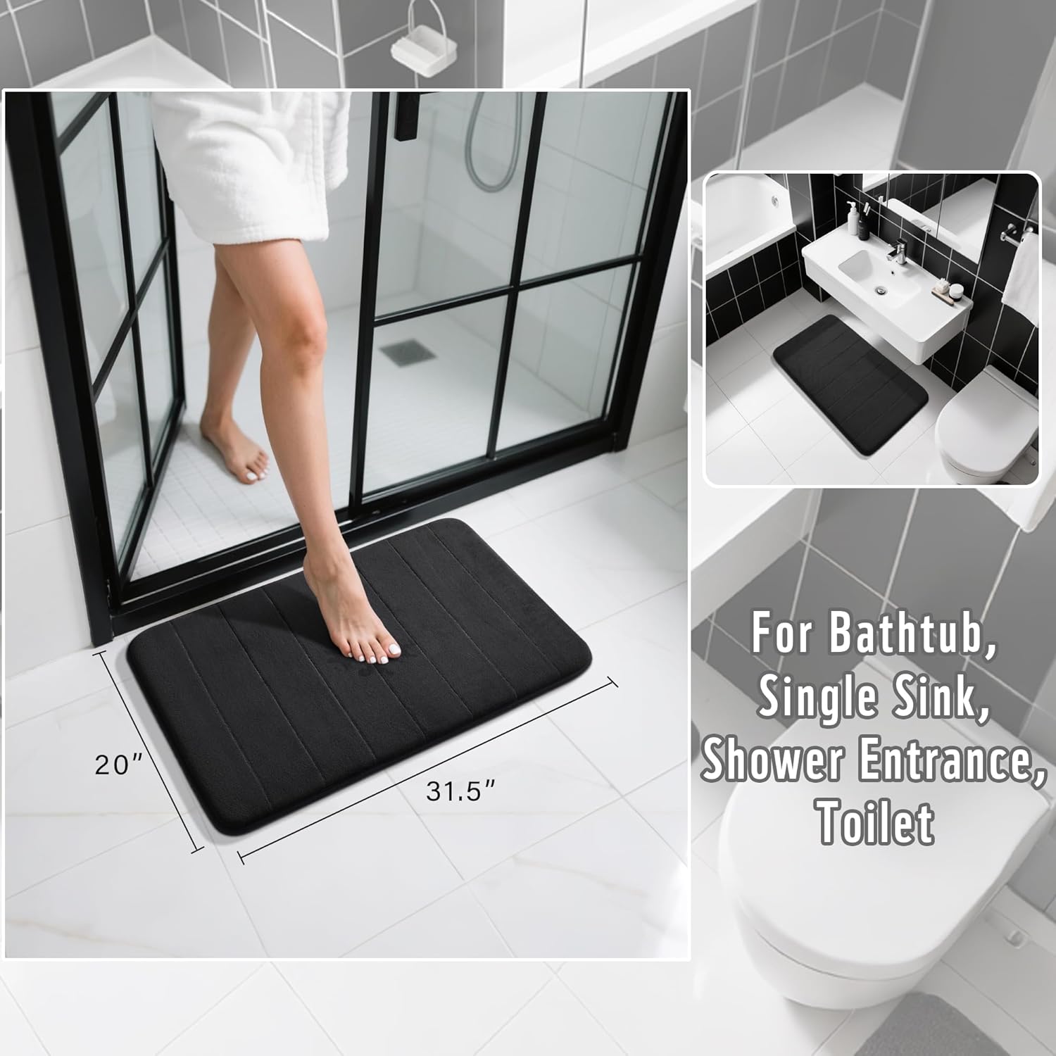 Yimobra Memory Foam Bath Mat, Super Soft Absorbent Bathroom Rug Non Slip 31.5x20 Inch, Quick Dry, Machine Washable Floor Carpet for Tub Shower, Home Decor Accessories, Black
