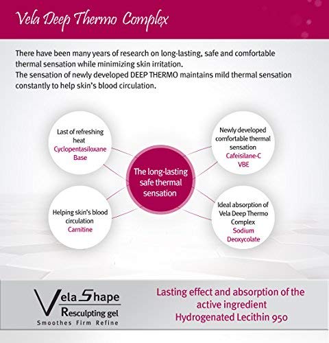 - VELA SHAPE RESCULPTING BELLY GEL: This is a hot cream cellulite treatment. Expect a warming effect from the Phosphatidylcholine (PPC) that generates an internal heat effect under the skin and significantly enhances the lipolytic and anti-cellulite effect of the cream. It makes a great smooth skin repair and tones your body, reshapes your silhouette, and minimizes stubborn fatty tissue.