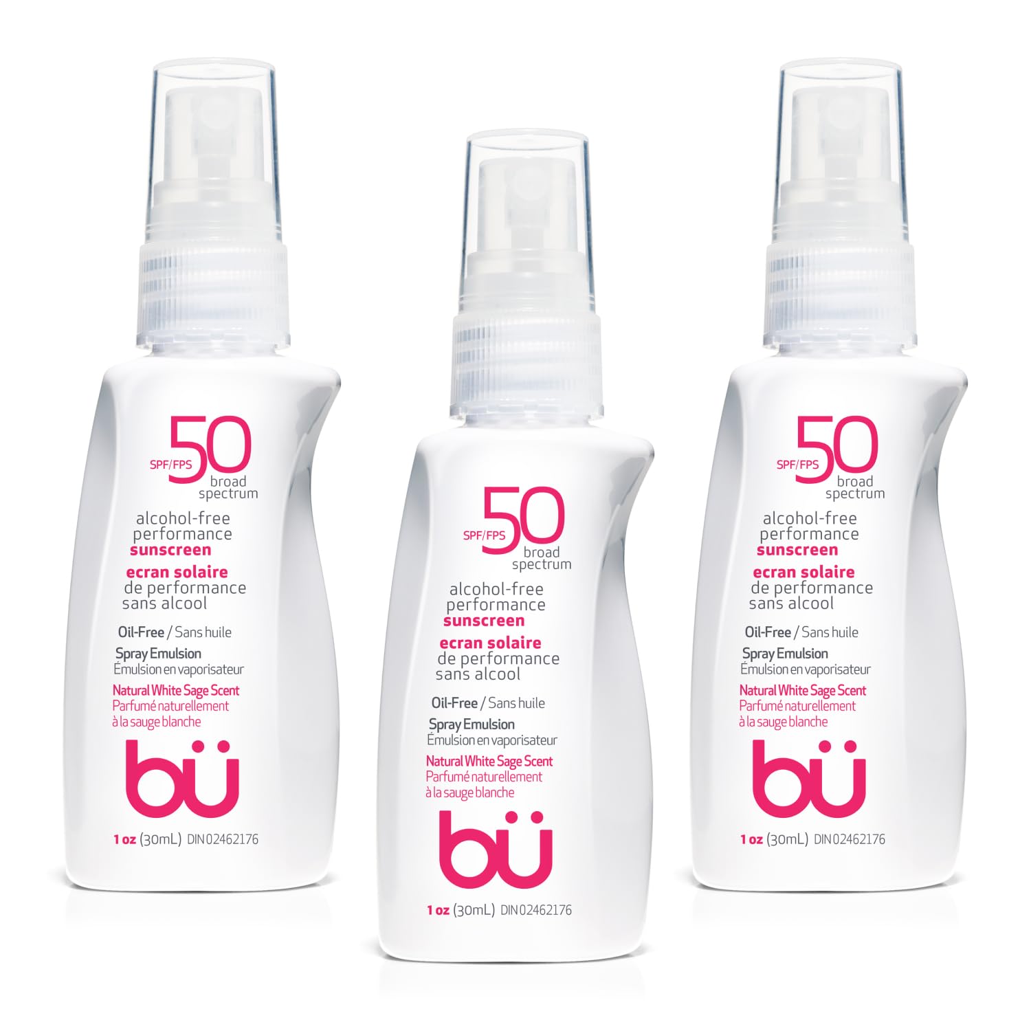 BU SPF 50 Sunscreen Spray for Face and Body, Non Aerosol Spray, TSA Travel Size Sunscreen, Clear, Non Greasy, Water Resistant, White Sage 1 oz (3 Pack)