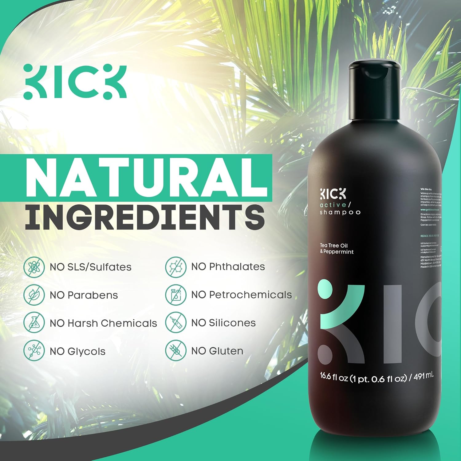 Kick Mens Shampoo - Peppermint & Tea Tree for Oil Control - Sulfate-Free, Refreshing Formula - Anti-Dandruff and Scalp Soothing - Shampoo for Oily Hair - Cruelty-Free - 16.6oz