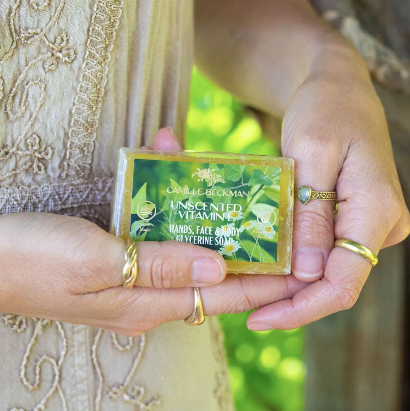 - Experience Camille Beckman’s Essentials Gift Basket containing Glycerine Hand Therapy 6 oz, Silky Body Cream 13 oz, Hand and Shower Cleansing Gel 13 oz, Glycerine Soap, a bath body net and fair-trade hyacinth leaf gift basket