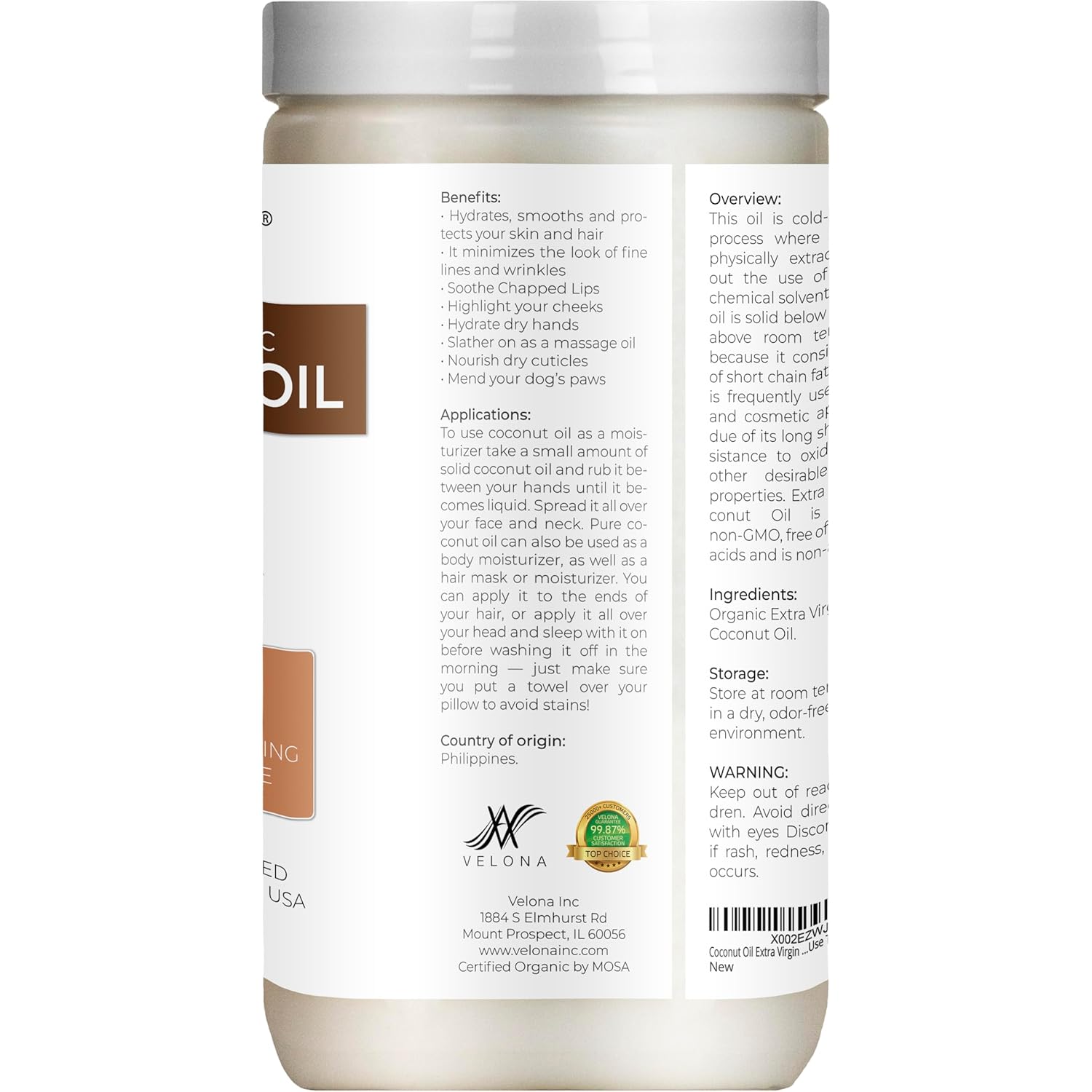 Velona USDA Certified Organic Coconut Oil Extra Virgin - 32 fl oz | Food and Cosmetic Grade | in jar | Extra Virgin, Cold Pressed