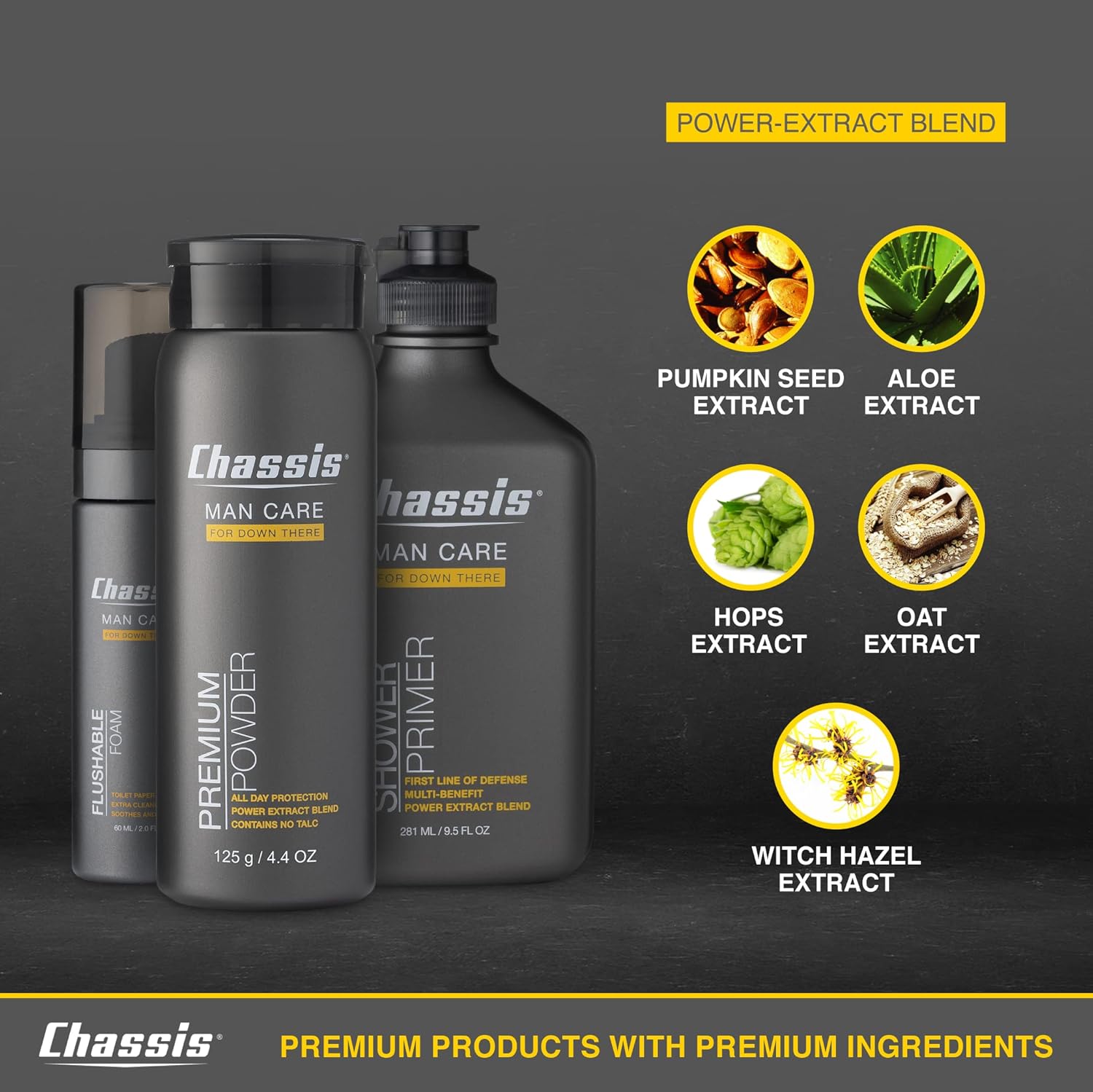 Chassis Gift Set with Flushable Foam, Premium Body Powder, and Shower Primer, Body Powder, Body Wash, and Flushable Wipe Alternative