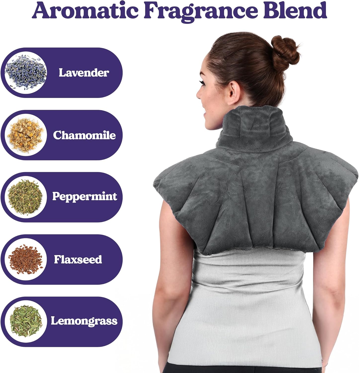 - Spa-Inspired Aromatherapy: Infused with lavender, chamomile, peppermint, and lemongrass, this microwavable heating pad surrounds your neck, shoulders, and back with soothing warmth and calming fragrance for spa-like relaxation at home