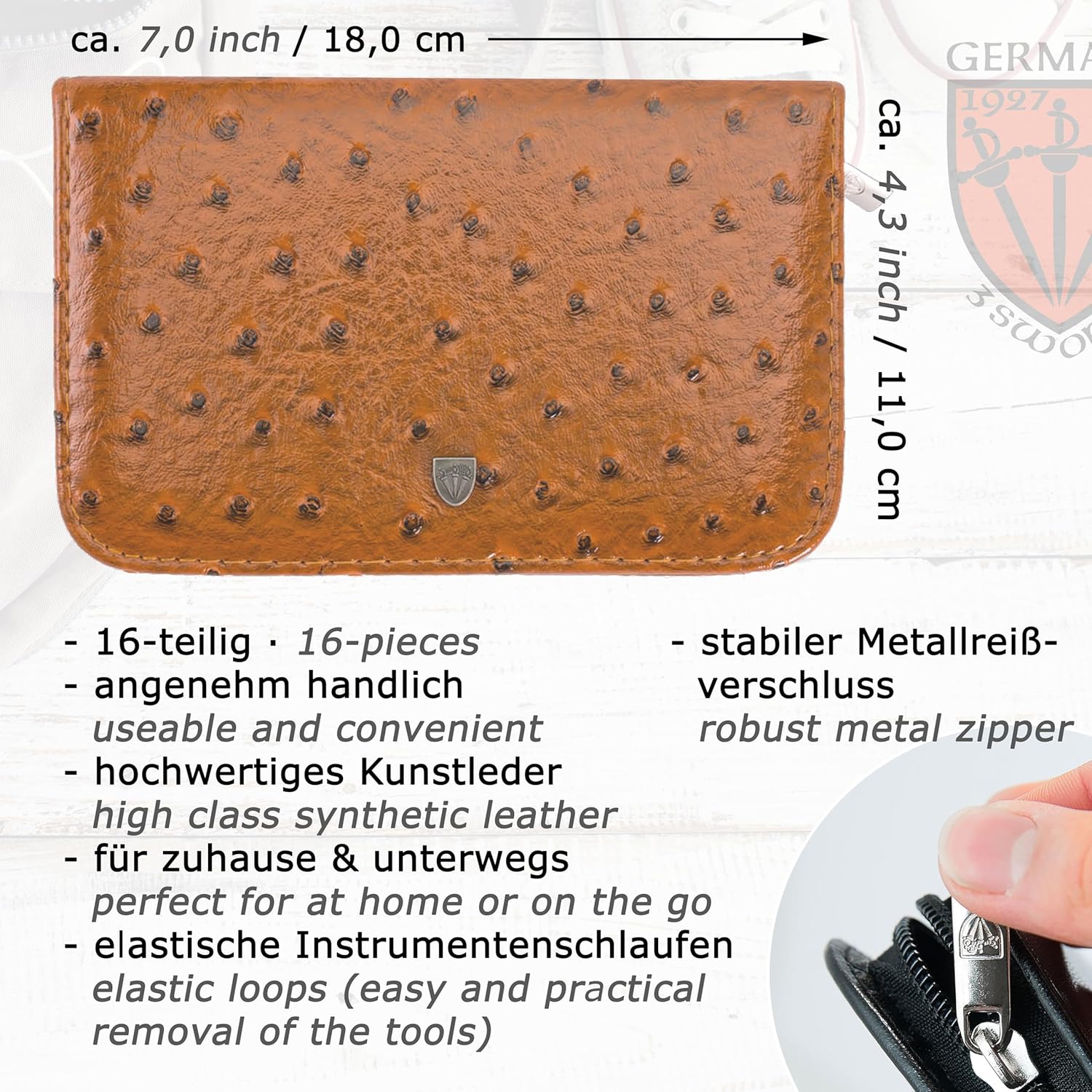 - CASE: Synthetic leather ostrich cognac, size ca. 20,5 x 12,5 x 3,0 cm. Our organizers are made of high-grade fashion or classic materials. Additional equipment: Microfiber cleaning cloth for cleaning steel items, general info sheet “Finger - Nail Grooming”.