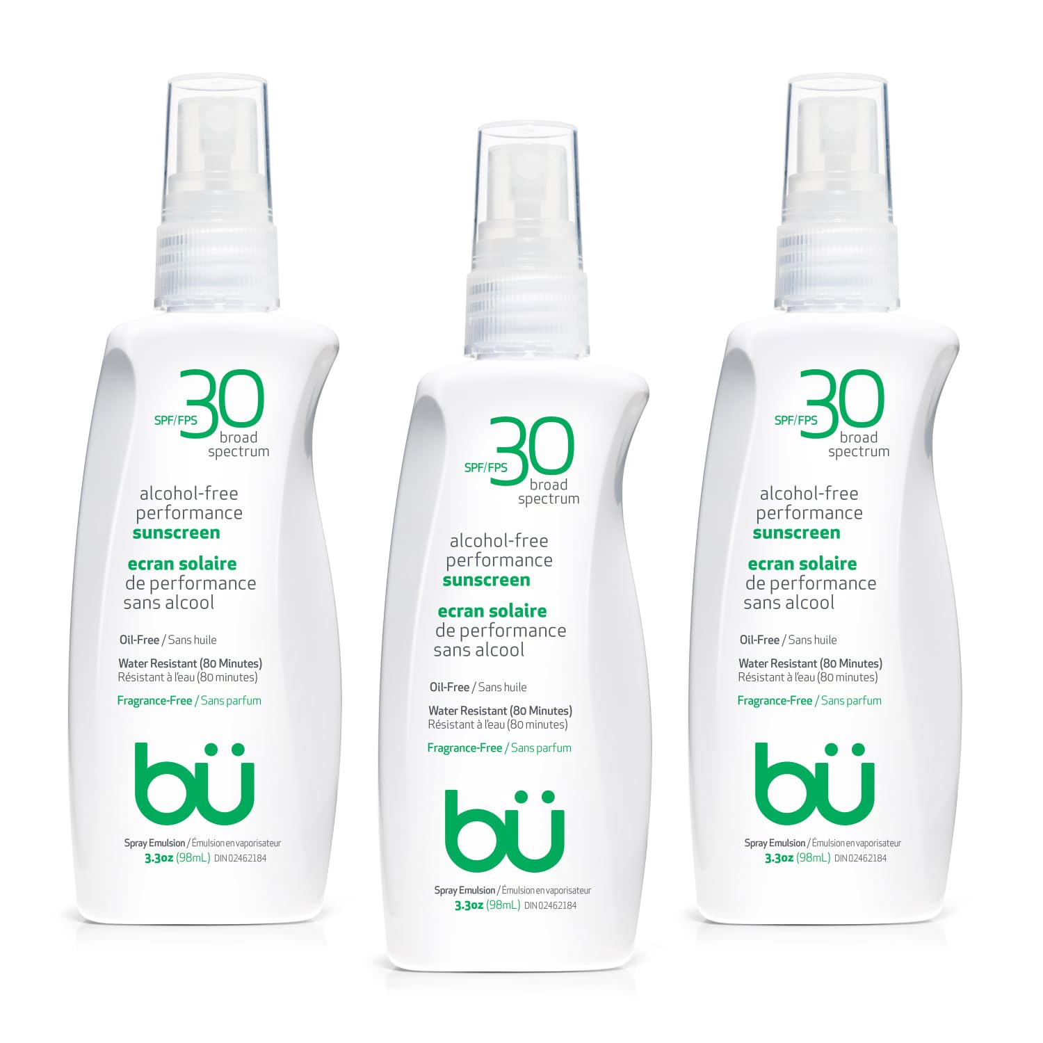 BU SPF 30 Sunscreen Spray for Face and Body, Fragrance Free, TSA Travel Size Sunscreen, Clear, Non Greasy, Water Resistant, for Sensitive Skin, 3.3 oz (3 Pack)