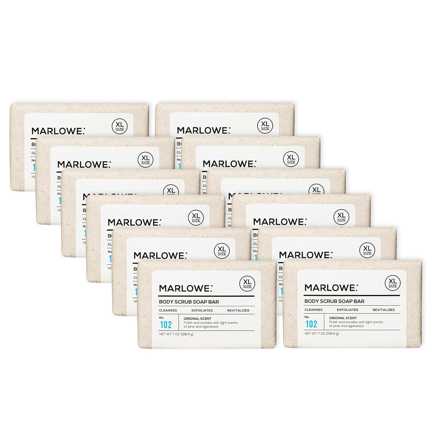 MARLOWE. No. 102 Body Scrub Soap 7 oz (12 Bars), Exfoliating Soap Bar with Shea Butter, Olive Oil & Green Tea Extracts, Cleanses, Smooths & Revitalizes Skin, Original Sage & Fir Scent