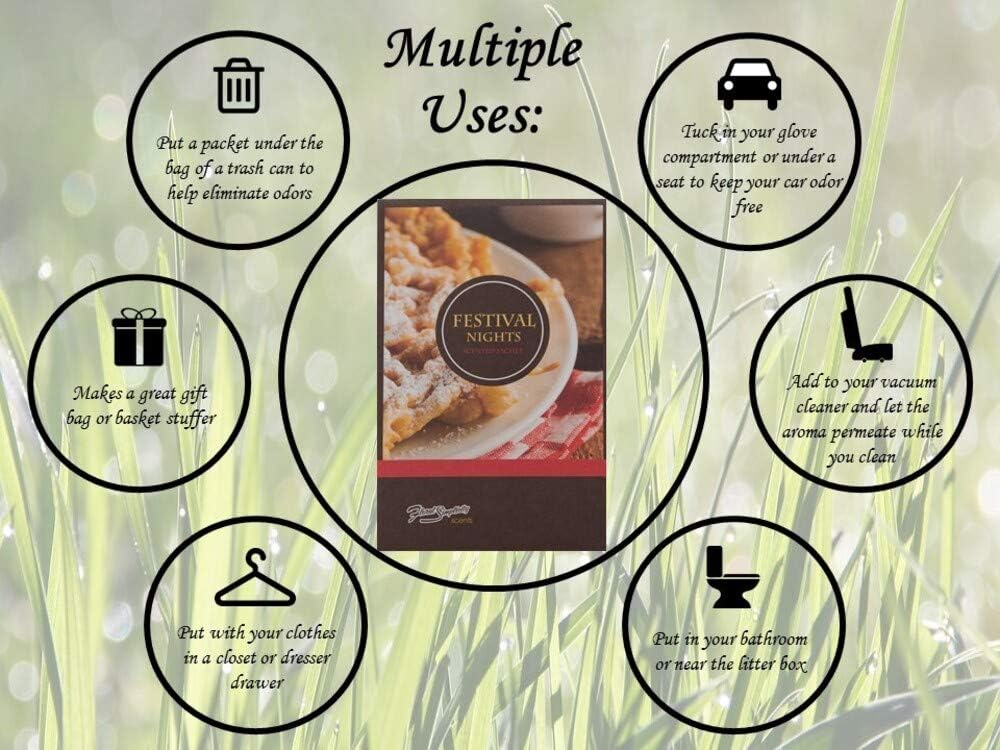 - SEASONAL AND TIMELESS SCENTS : Relive the nostalgia of summer carnival nights with our Festival Nights Sachet. The sweet aroma of warm funnel cake fills the air, evoking memories of fun rides and laughter with loved ones. Bring the joy of summer into your home anytime, all year long.