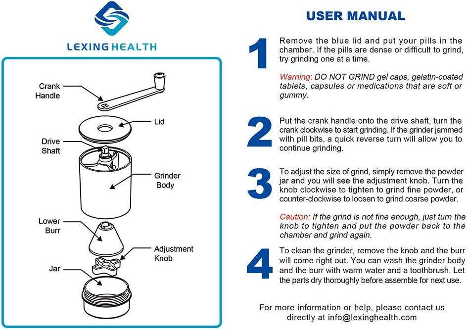 - ADJUSTABLE GRIND SIZE - Medications can be pulverized to a very fine powder for feeding tube. Follow our instruction to adjust the grind size for kids or adults who have hard time swallowing pills. It works for pets too.