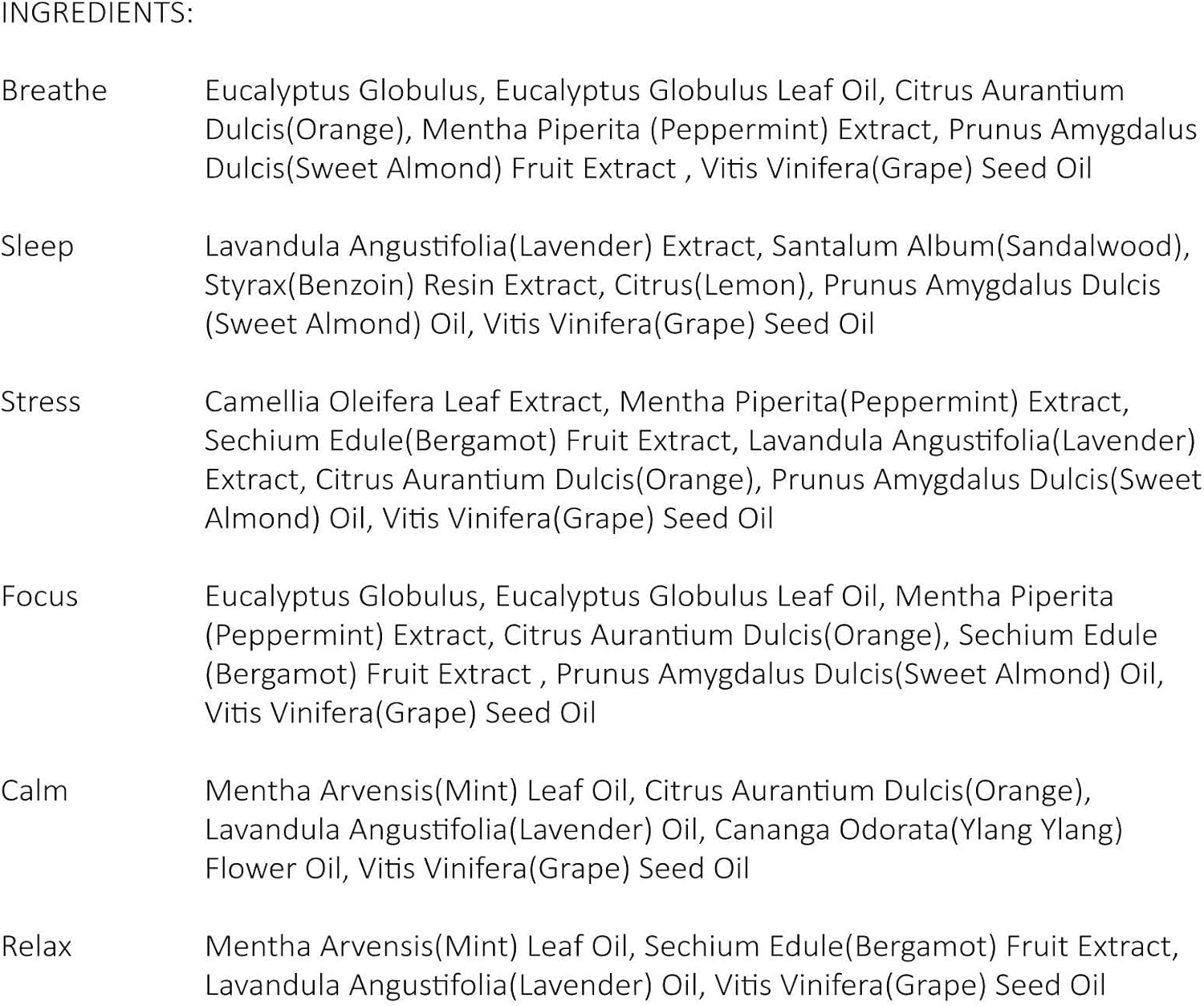 - 1. SIX NATURAL ROLL-ON BLENDS - Our essential oils set includes 6 packs of 0.33fl.oz/10ml amber roller bottles, each containing a unique blend for Breathe, Sleep, Stress, Focus On, Calming and Relaxation.