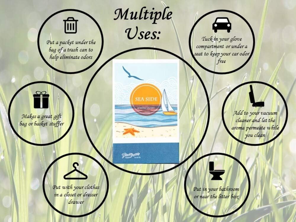 - SEASONAL AND TIMELESS SCENTS : The scent of the shore, with waves crashing and seagulls soaring overhead, fills the air with the refreshing aroma of saltwater. Our SeaSide sachet captures this summer favorite, blending light, sweet notes with a hint of grapefruit for a fresh, coastal vibe. Perfect for any space!