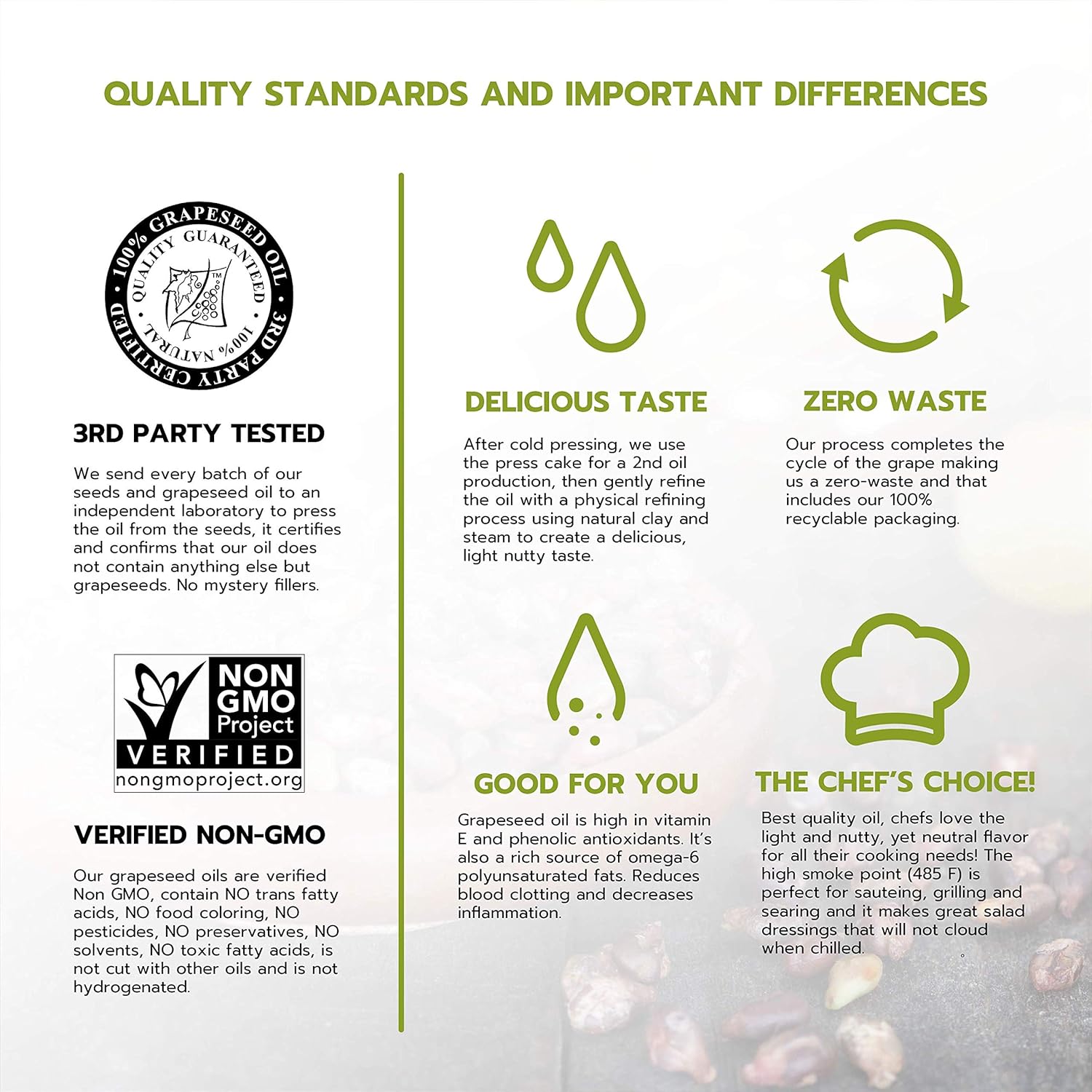 - QUALITY: 3rd Party Certified 100% grapeseed oil - no mystery oils added. We have produced grapeseed oil for 30 years and continue to bring only the best quality grapeseed oil to our customers.