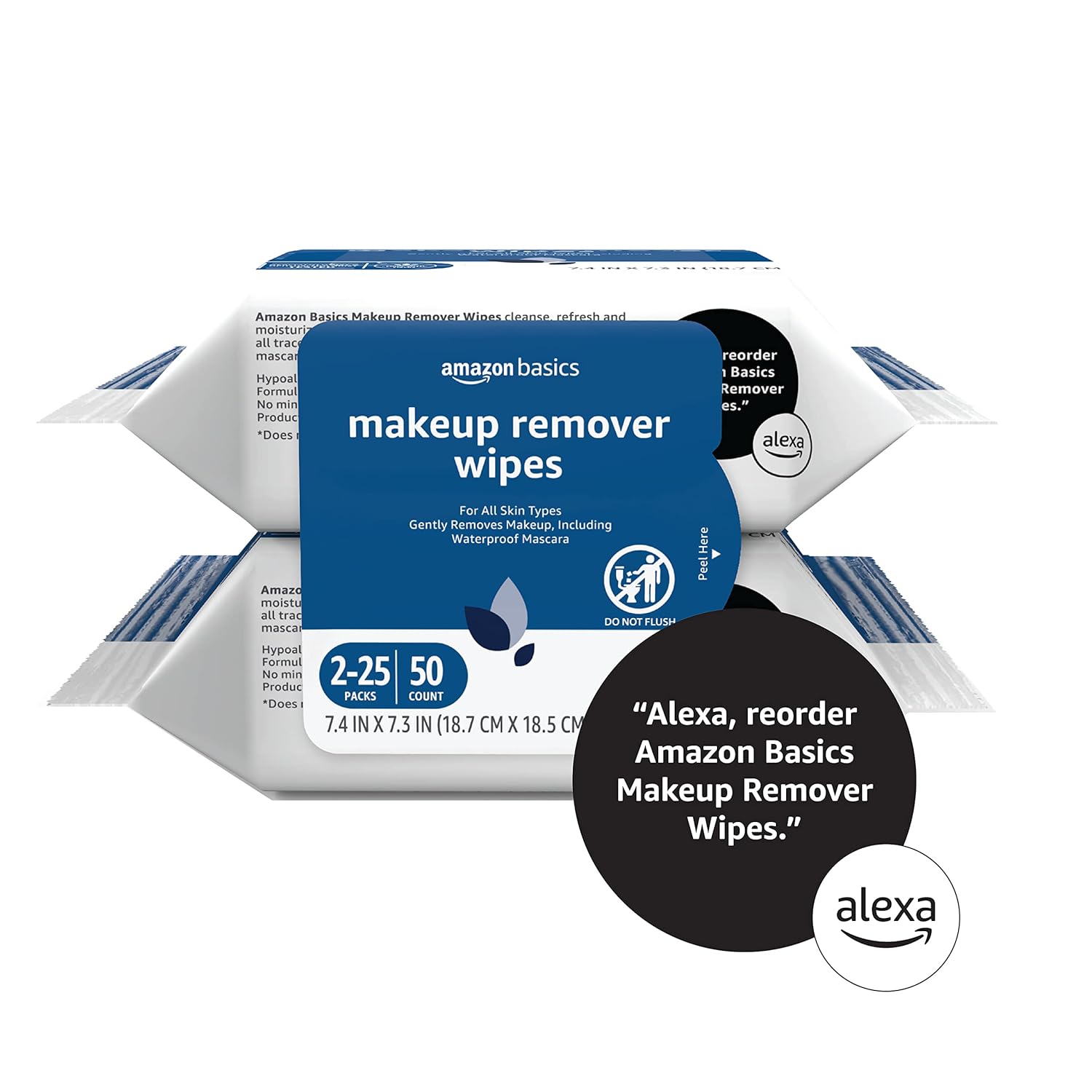 - Two resealable 25-count packs of Amazon Basics Makeup Remover Wipes that cleanse, refresh and moisturize your face