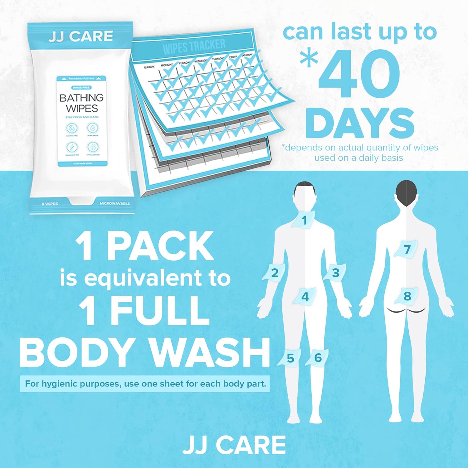 - Waterless Shower - How convenient can that be? JJ Care's adult bathing wipes allows handy body cleansing without the need to rinse with water. These are single-use bath wipes infused with cleansing ingredients, leave your skin fresh & moisturized.