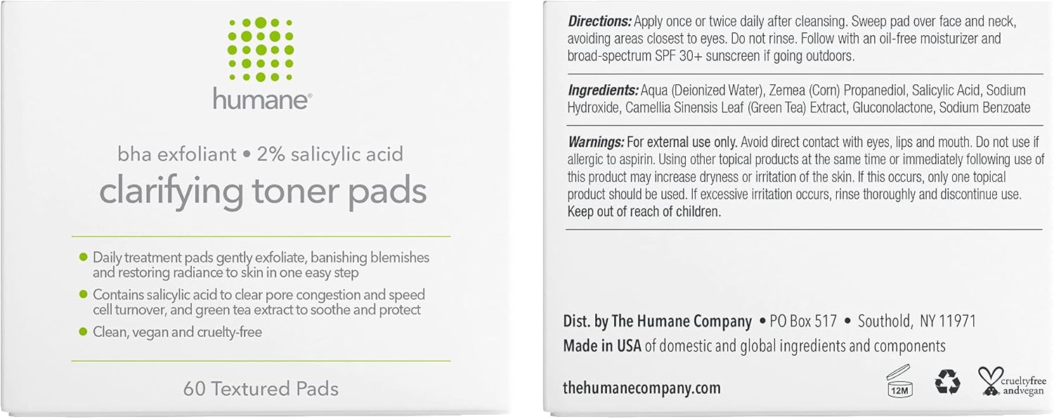 - Humane Clarifying Toner Pads: Effective and super-convenient, these textured Clarifying Toner Treatment Pads come presoaked in a breakout-fighting blend of 2% salicylic acid (an oil-soluble BHA, or beta hydroxy acid) and antioxidant-rich green tea extract. Pre-moistened textured pads work to deep-clean, exfoliate, and brighten skin in one easy step. Dermatologist-tested. Contains 60 textured pads.