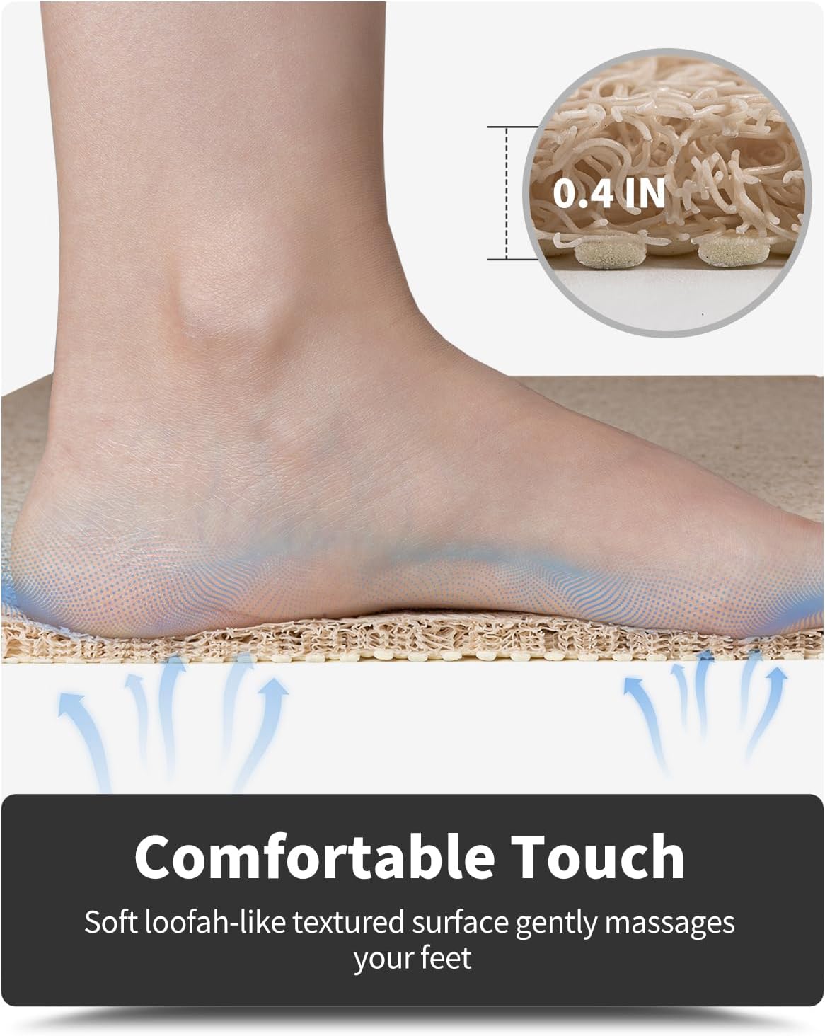 - Comfort Shower: Soft loofah-like textured surface of ideal thickness makes this shower rug comfortable for your shower in bare feet. Besides cutting the cold hard floor off from your body and providing a warm support, it also gently massages and exfoliates your skin.