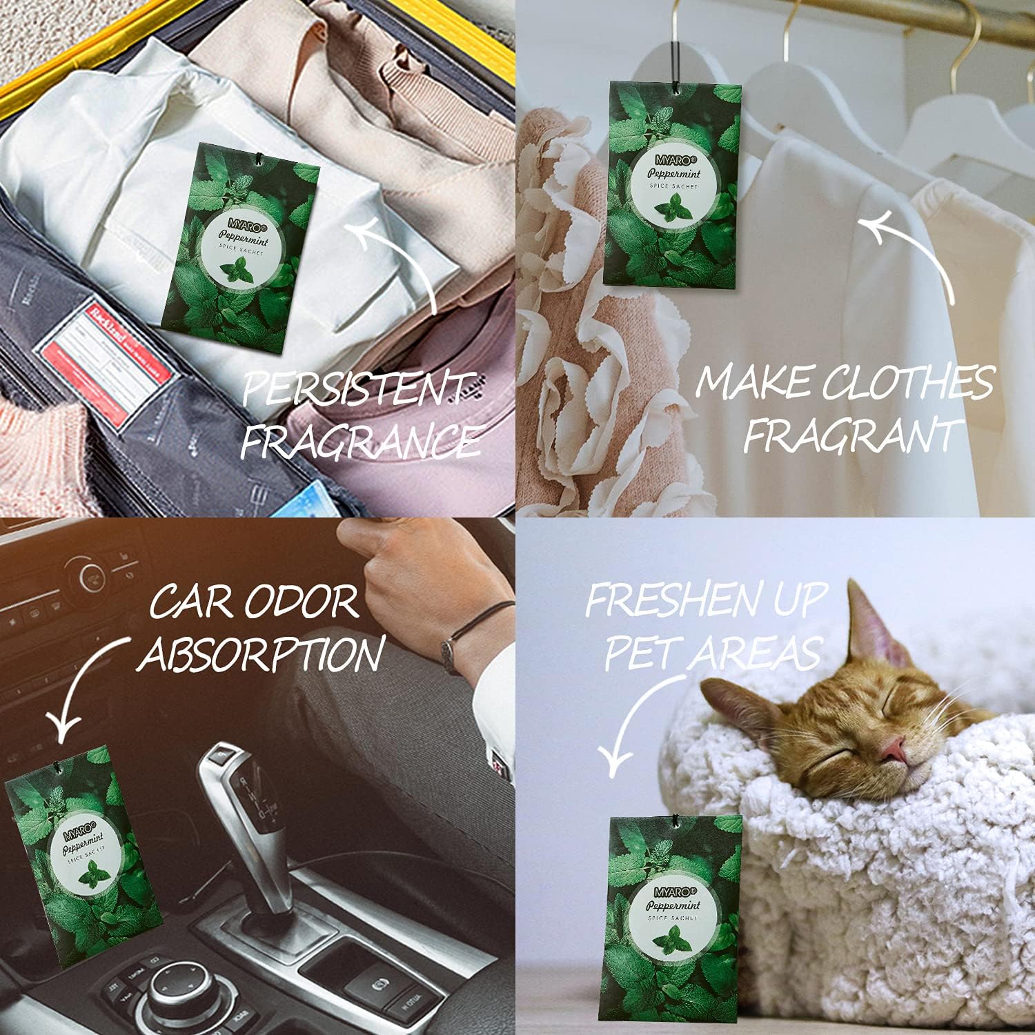 - MYARO Peppermint sachet bags: Includes 12 scented sachets (each bag size: 4.13 inch x 2.76 inch). Our natural fragrance will take you on a journey with the Peppermint fresh scents sachet packets