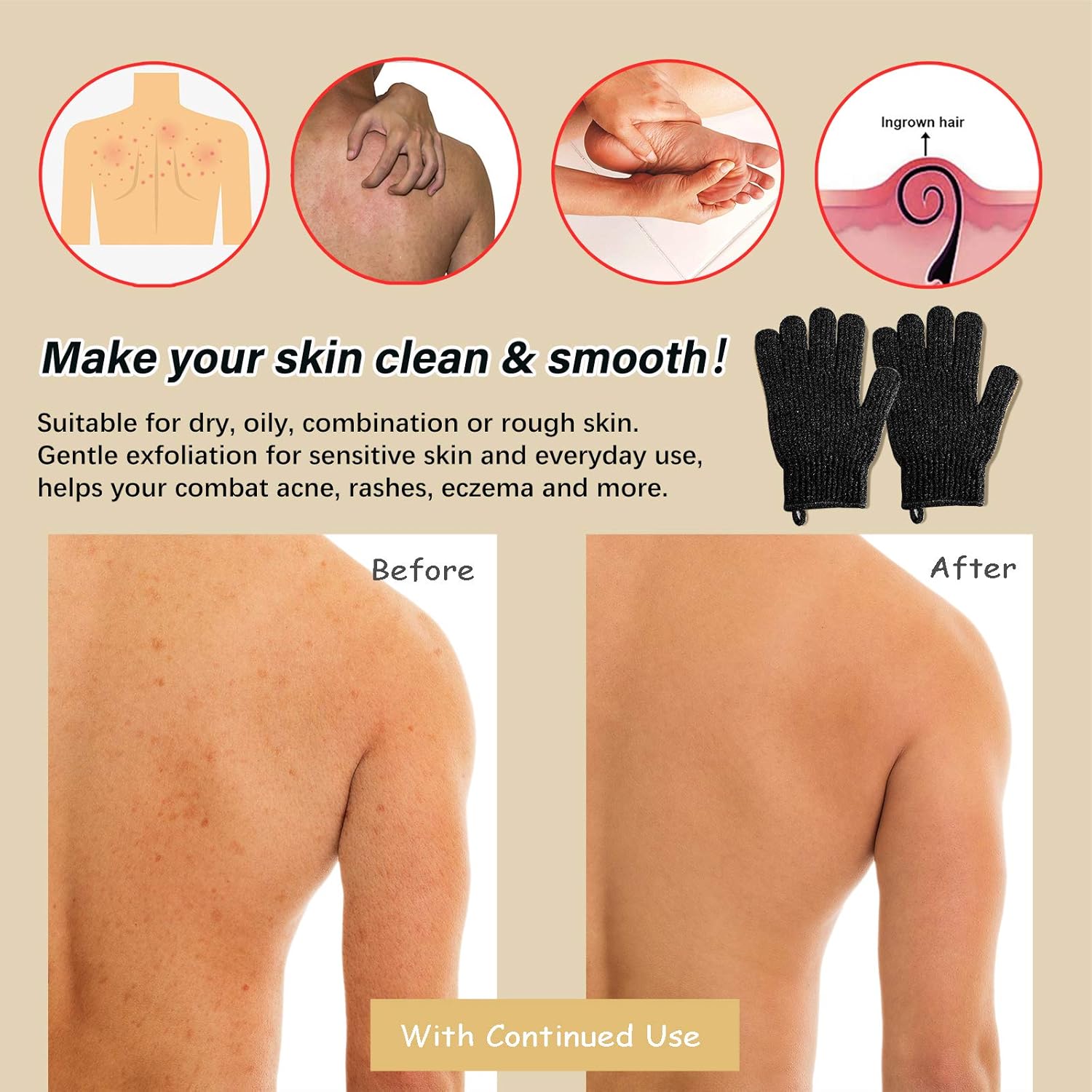 - Bring smooth skin: wash gloves for bathing work with soap, body scrubs, shower gels, or sea salts can deep clean your skin, remove dead skin, helps to renew it. Leaving your skin glowing and improve blood circulation.