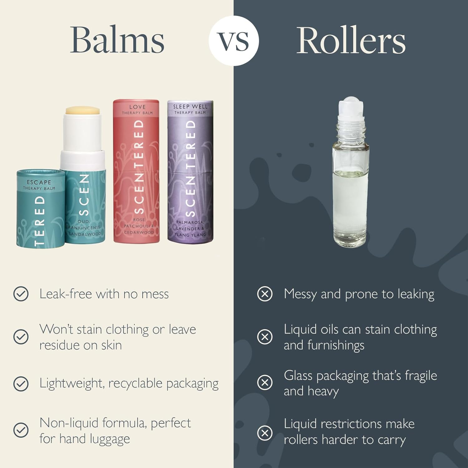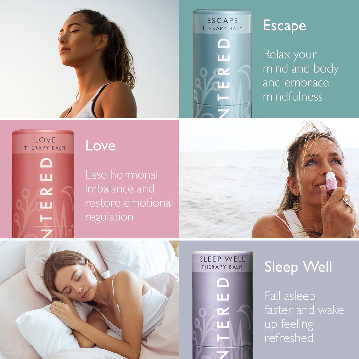 - Aromatherapy Balms: Love, Escape & Sleep Well – The Love Balm provides emotional support and balance with a soothing blend of rose essential oil, the Escape Balm clears the mind and promotes peace and calm with grounding frankincense essential oil, and the Sleep Well Balm, an all-natural sleep aid, encourages restful sleep with lavender essential oil roll on benefits. Perfect for self-care, relaxation, and better sleep on the go. 5g / 0.17 oz each.