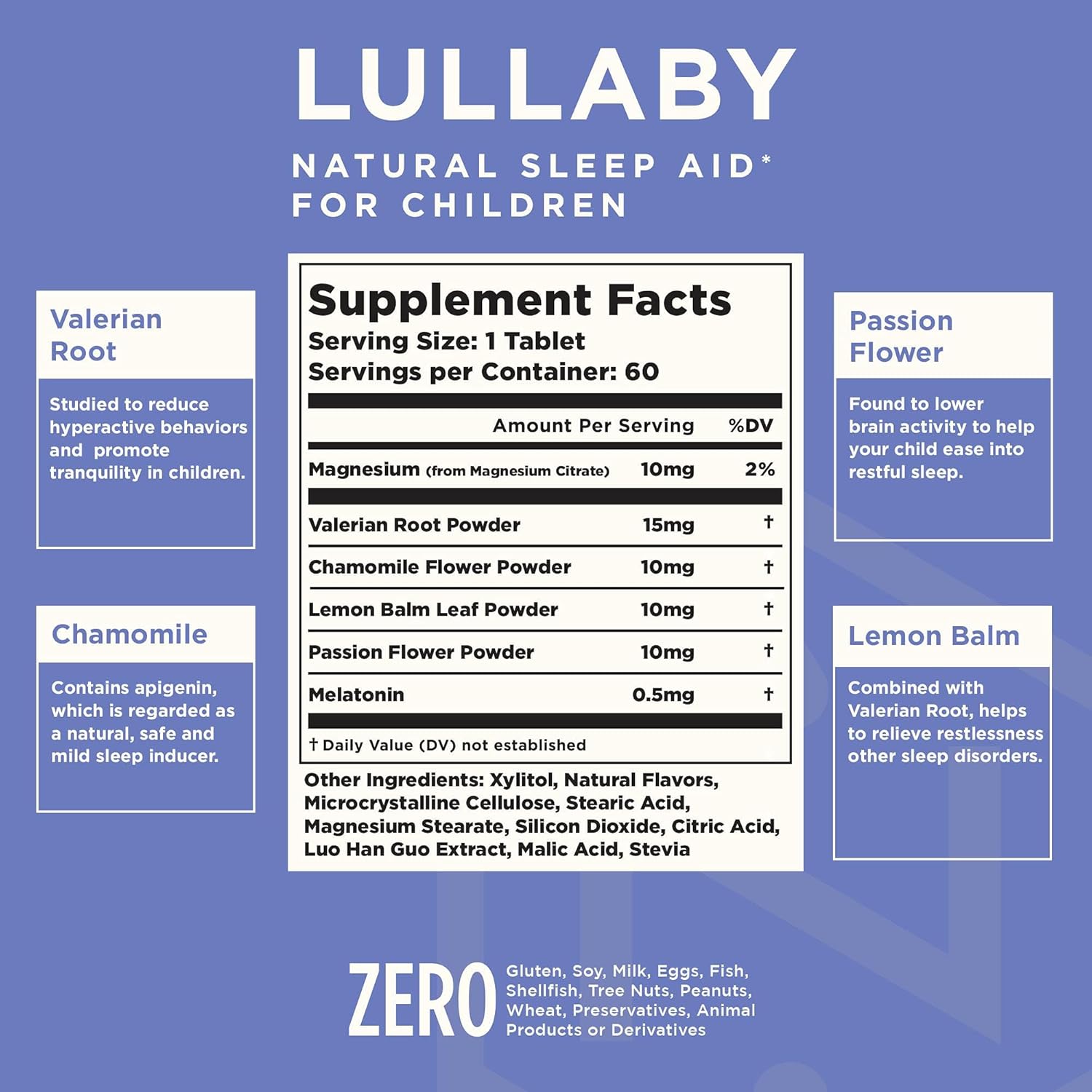 - SAFE & SOUND SLEEP: This unique blend of melatonin, lemon balm, passionflower, valerian root, and chamomile, work together to calm your child's mind and promote tranquility at bedtime. Give your child the peaceful and restorative sleep they need with Nuvana Lullaby. Our berry-flavored herbal sleep aid is non-habit forming, drug-free, and safe for children aged 3 and up. Help your little ones wake up refreshed and ready for the day with Nuvana Lullaby.