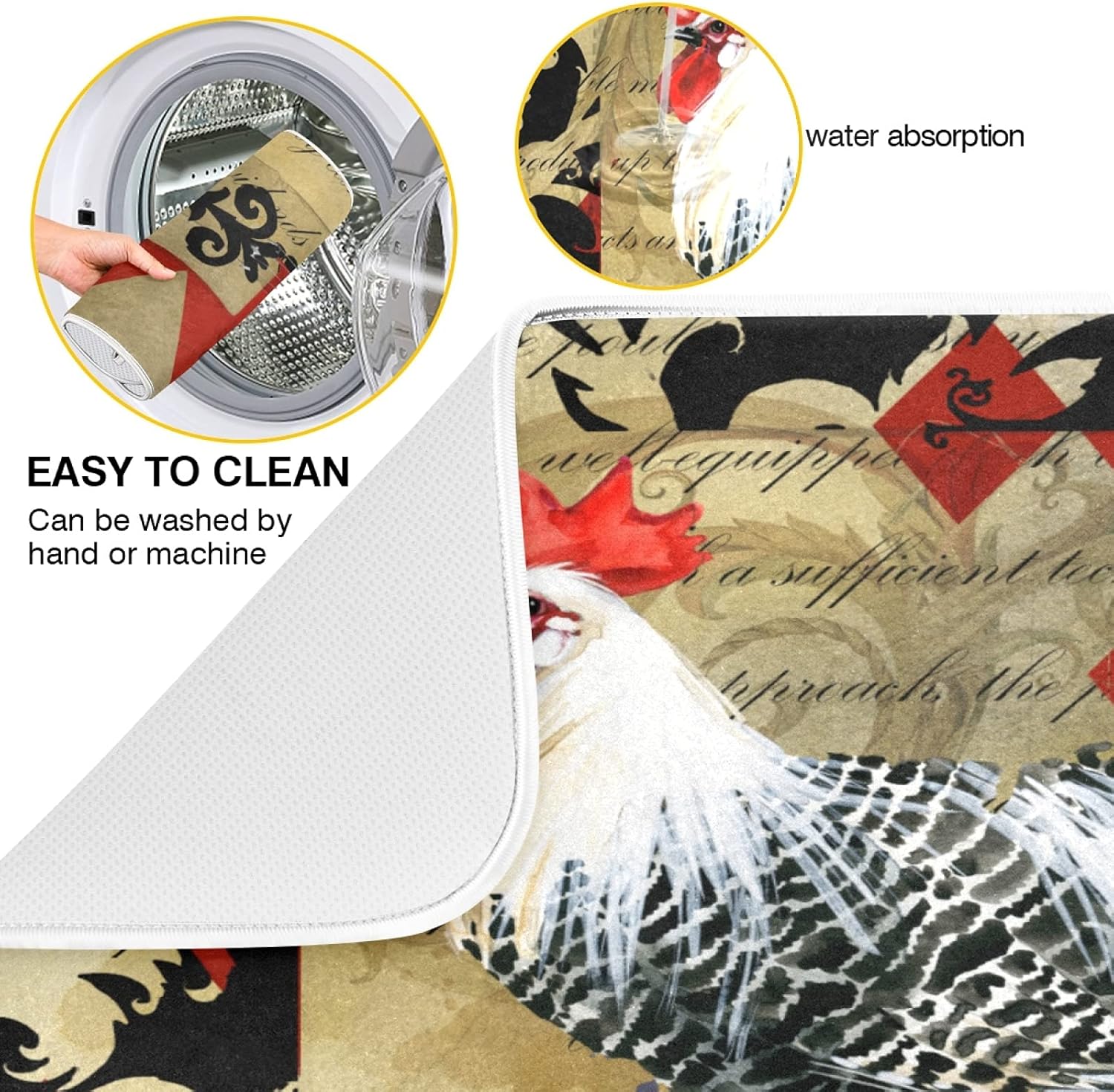 Dish Drying Mat for Kitchen Counter 18 x 16 Inch Rooster Vintage Domestic Farm Birds Microfiber Dish Mat Drying Pad Absorbent Dishes Pad Dish Drainer Rack Mats