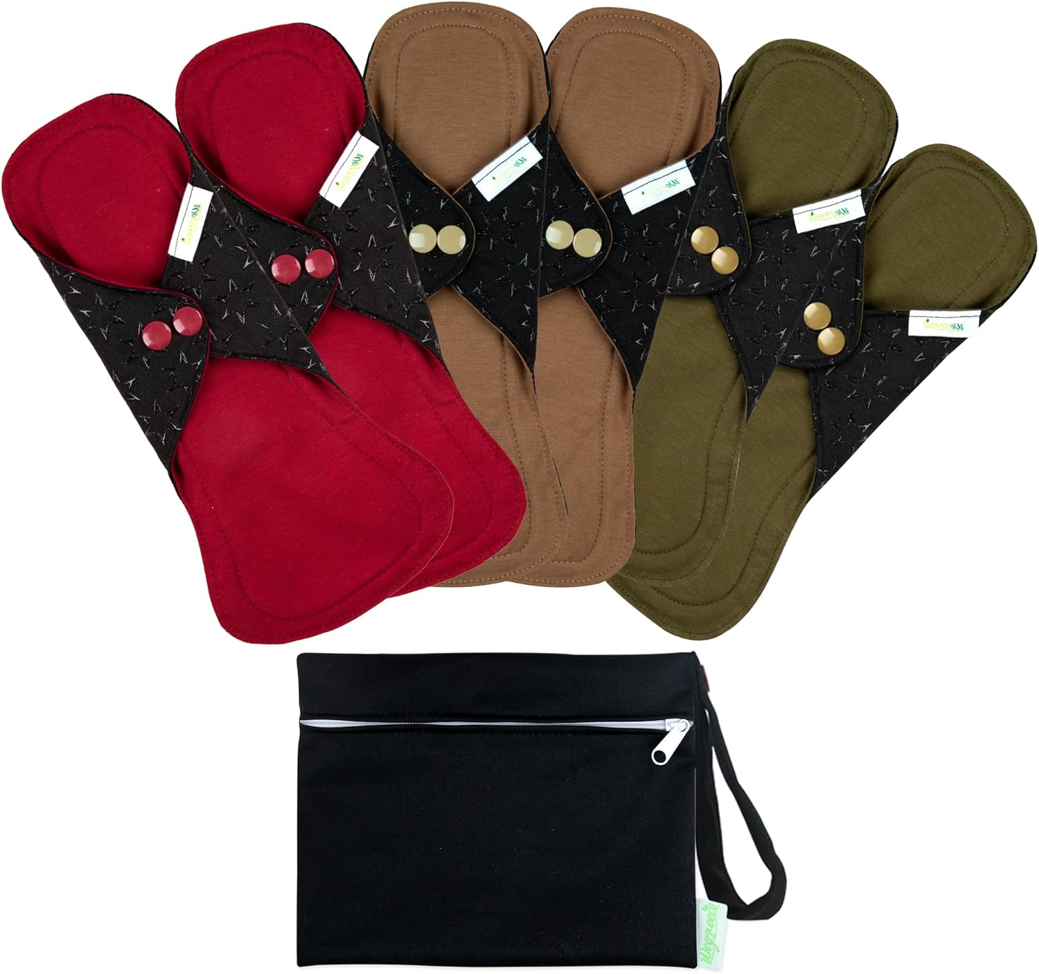 wegreeco 6 Pc Reusable Menstrual Pads, Ultra Absorbent Cloth Pads for Light/Heavy Flow, Sanitary for Teens, Women, Nonslip Panty Liners + Bag (Aqua, Burgundy, Coffee, XL)