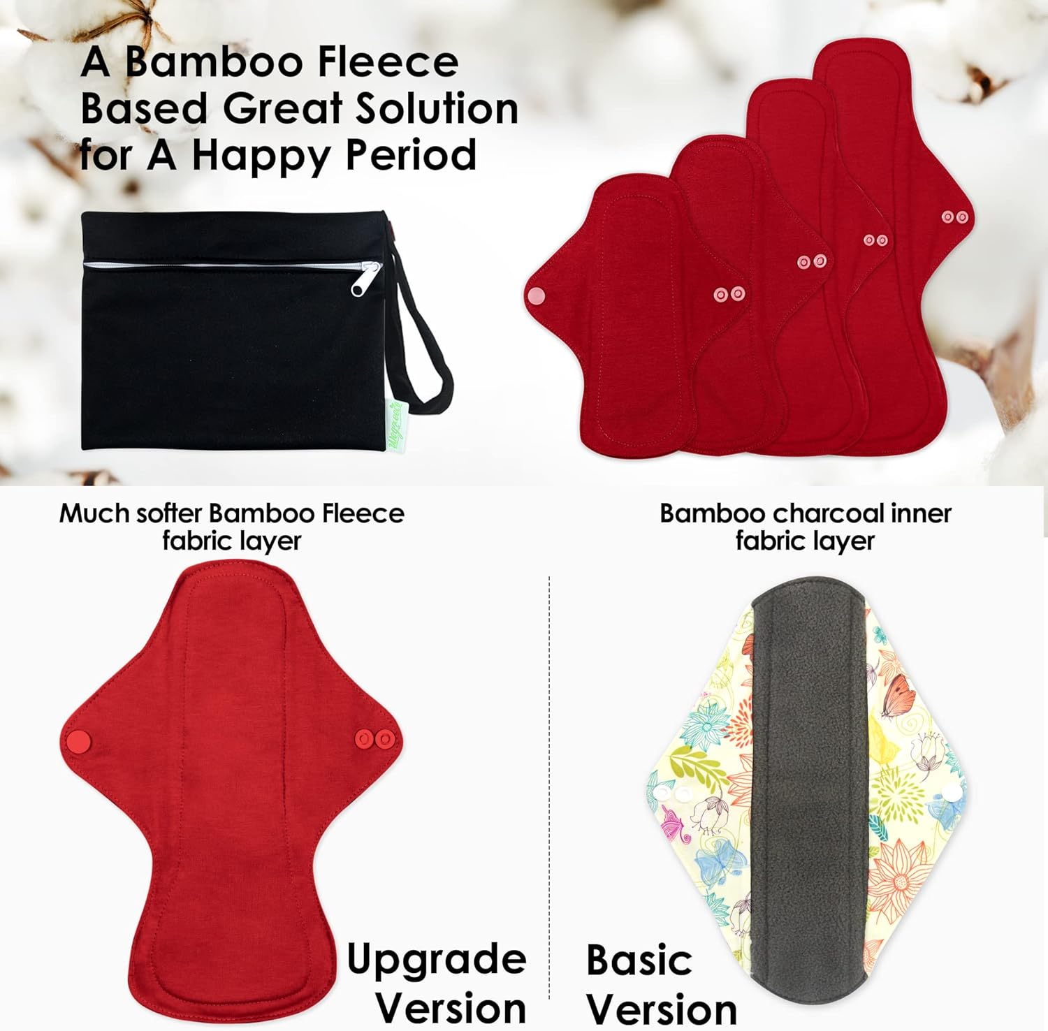 - Breathable Layer: Cloth panty liners structure differ depending on the size. Menstrual cloth pads Inner layer is ultra-soft fleece which lays against your skin, moistures wicking, and neutralizes odor. Lining layer is super-absorbent, and different sizes the layers are different. Outshell layer is leak-free TPU with backside silicon dot. The soft and gentle reusable sanitary pads offer great coverage and absorbency to keep you from leaks and spills
