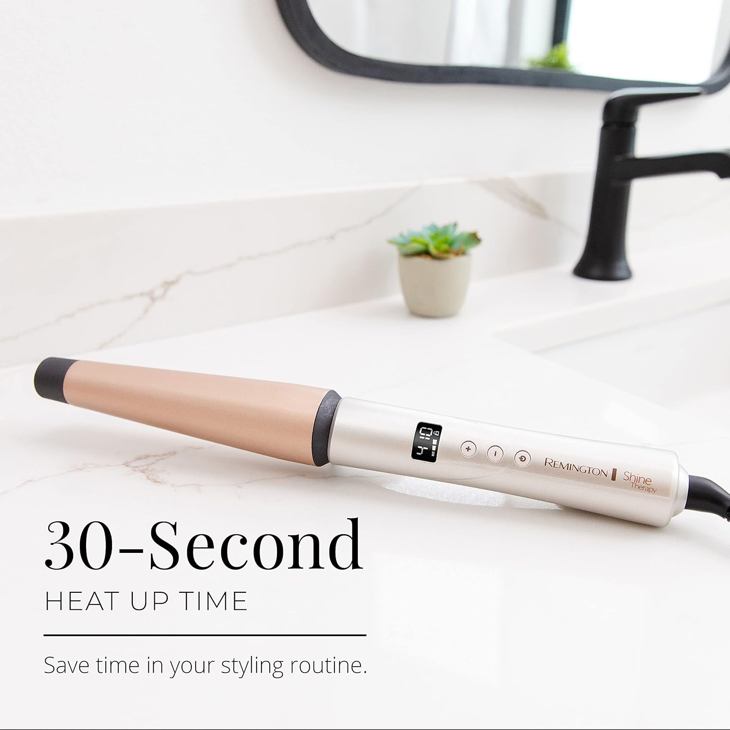 REMINGTON SHINE THERAPY Curling Wand, Infused with Argan Oil & Keratin, 1-1 ½ Inch Tapered Curling Iron for Tousled Waves, includes Heat Glove