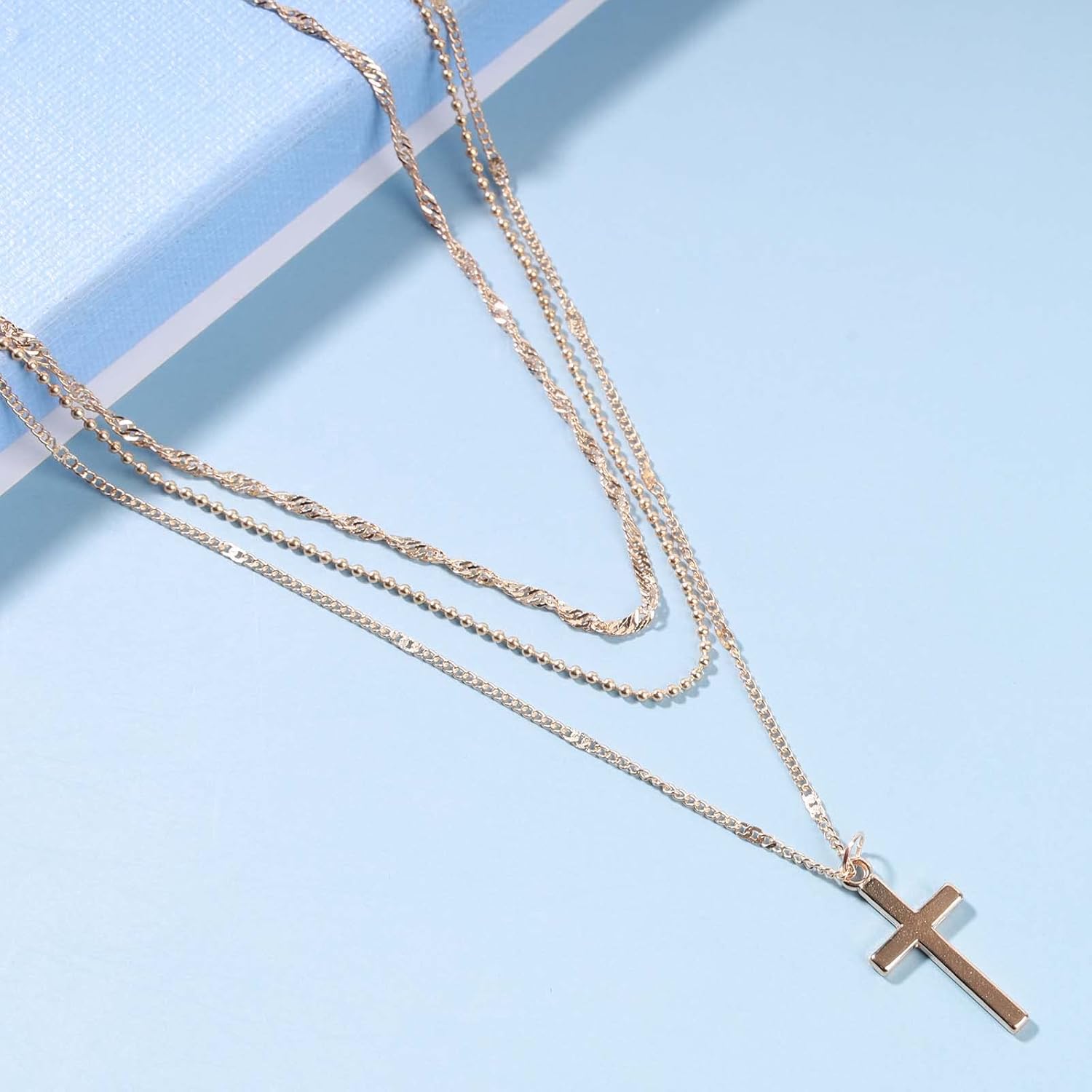 Boho Layered Cross Necklace Choker Gold Cross Pendant Necklace Vintage Multi Layer Necklace Skinny Twist Chain Necklace Jewelry for Women and Girls Religious Gift for Her
