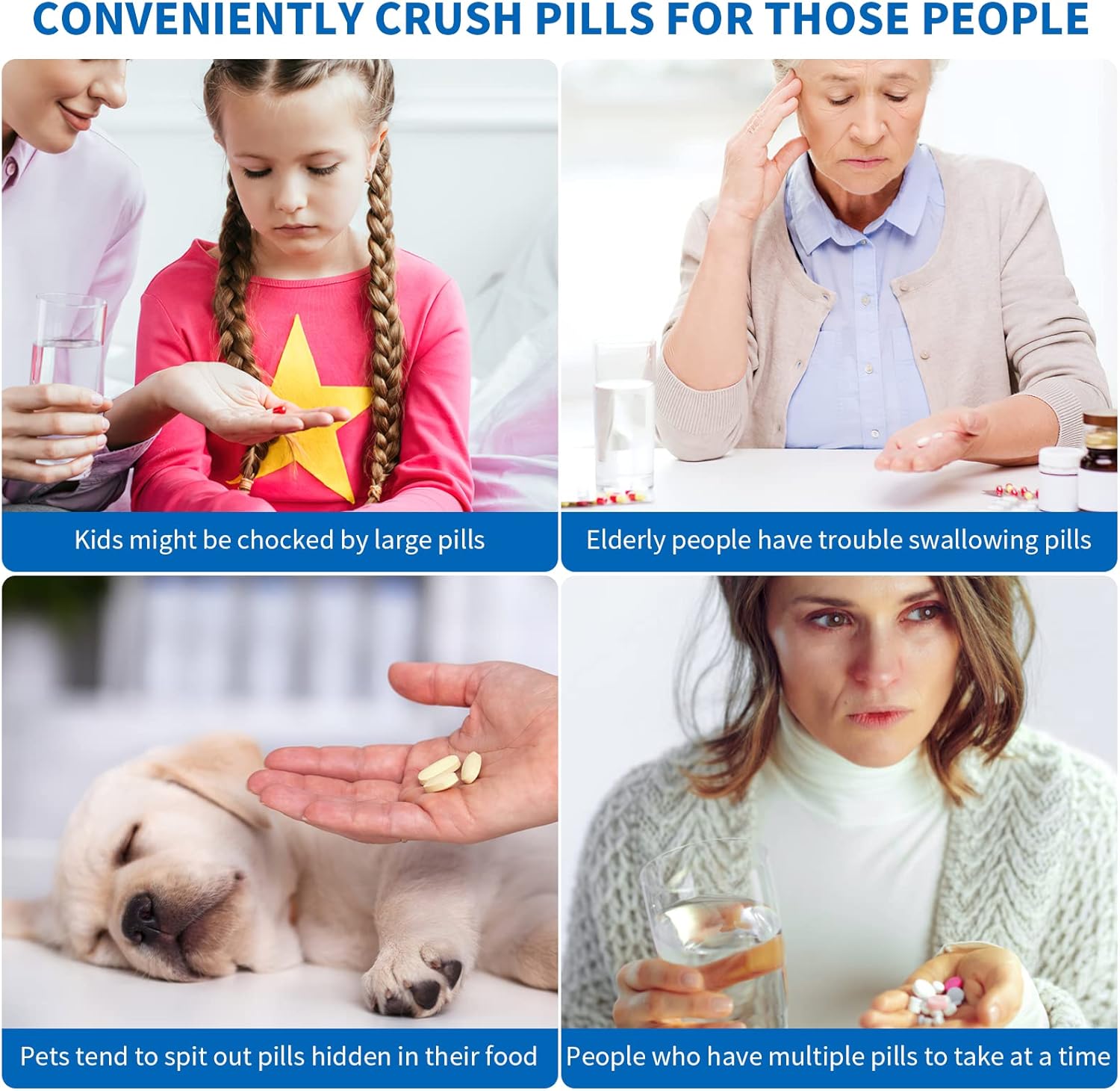 - 【HANDLES MORE THAN 100 TABLETS OF ANY SIZE】 Whether your current medications are large or small, our pill pulverizer will effectively grind whole pills and tablets. The large pill crusher also holds over 100 pills at one time for easy medication management. Adopts a double sealing cover design with double protection, which is more effective in preventing tablets from splashing around when it is working.