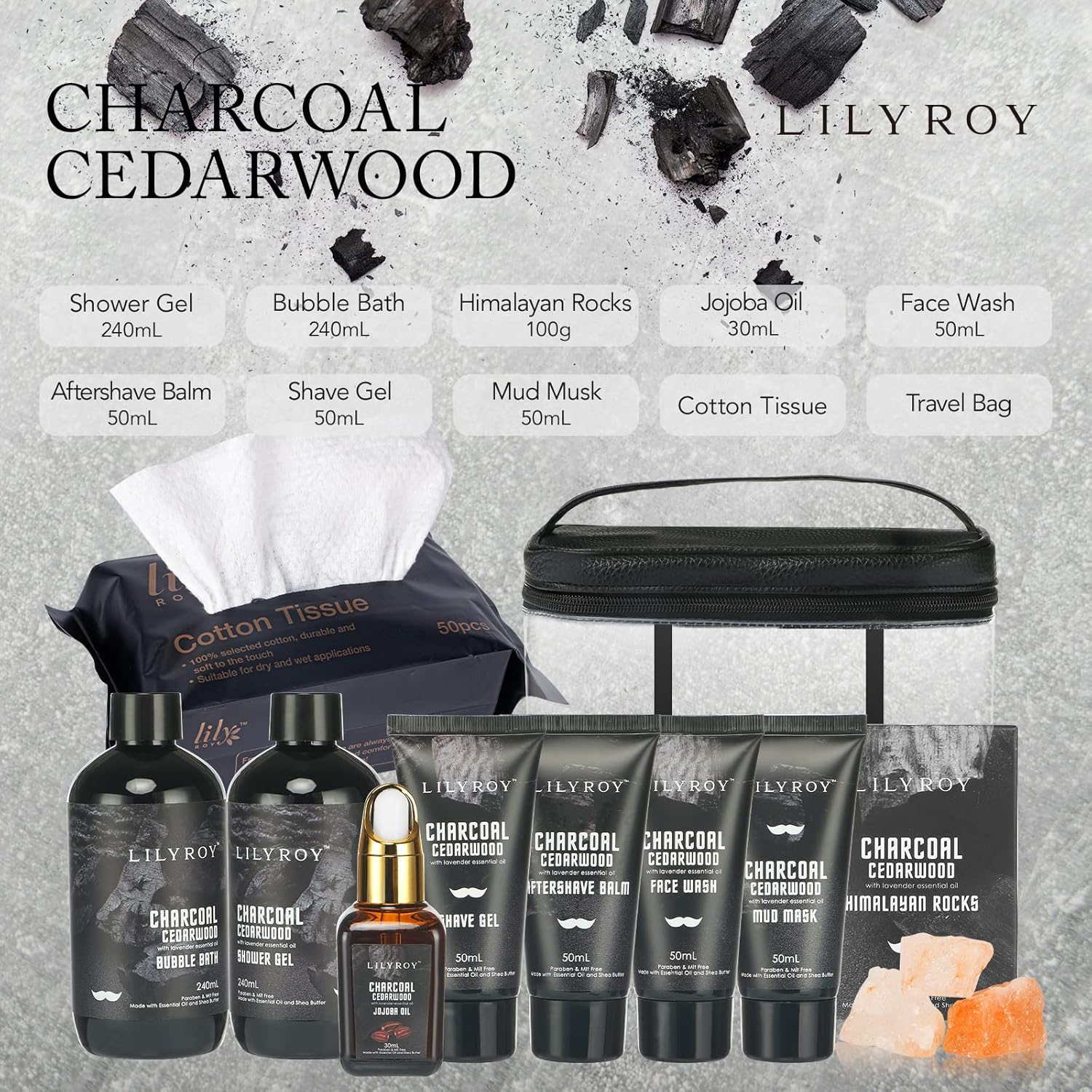 - 10 PCS GIFT BASKETS FOR YOUR LOVER: This complete gift set contains premium facial skin care products w/ 240 mL Shower Gel, 240 mL Bubble Bath, 100 g Himalayan Rocks, 30 mL Jojoba Oil, 50 mL Face Wash, 50 mL Aftershave Balm, 50 mL Shave Gel, 50 mL Mud Musk, Cotton Tissue
