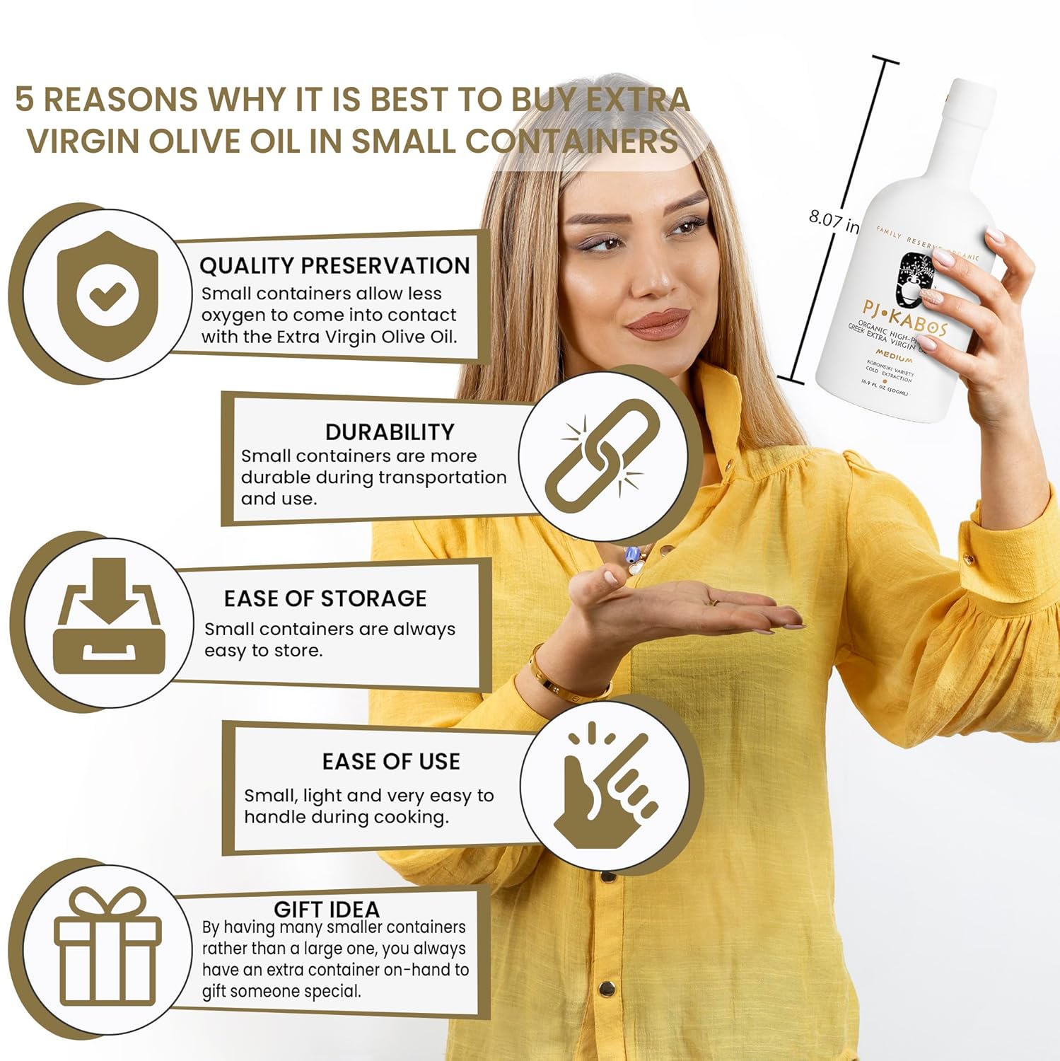 P.J. KABOS 2024/25 Harvest, High Phenolic (500+mg/kg), USDA Organic Greek Extra Virgin Olive Oil, Kosher, Greece, Cold Extracted, 6 x 16.9 oz, Koroneiki, "Family Reserve Organic -Medium"