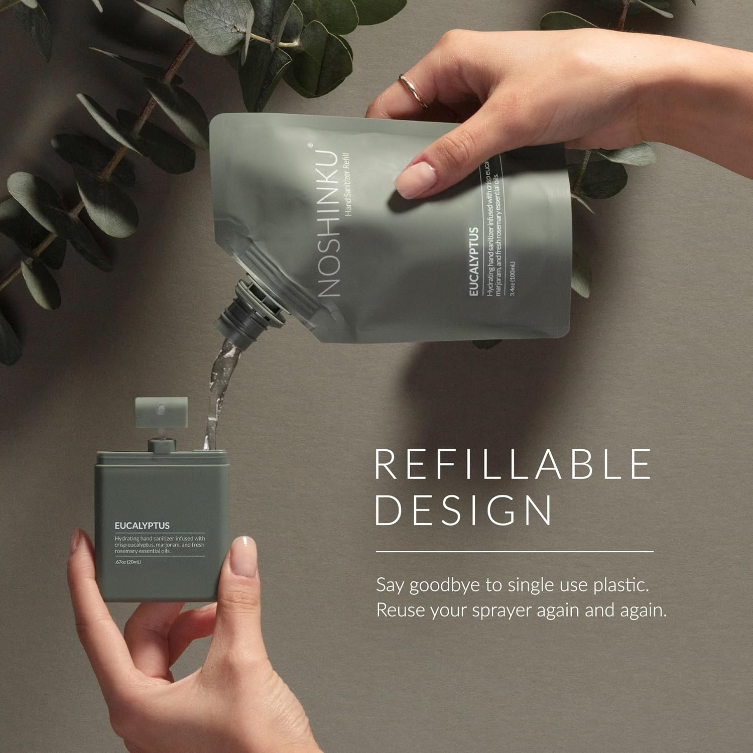 - REFILLABLE POCKET SPRAYERS: Includes 4 refillable pocket hand sanitizer sprayers in Bergamot, Eucalyptus, Lavender, and Orange Coriander. Each sleek, soft-touch travel hand sanitizer delivers over 300 mists, helping you reduce plastic waste with our sustainable refill design.