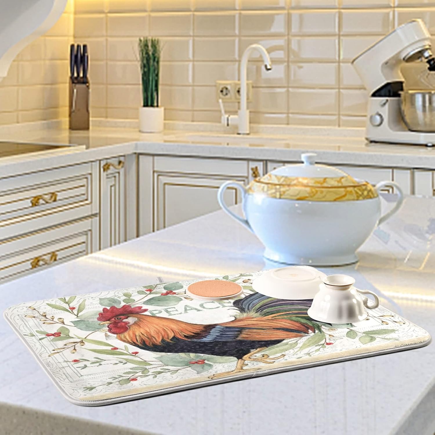 Farmhouse Rooster Farm Dish Drying Mats for Kitchen Drying Mat 16 x 18 Inch Absorbent Microfiber Drying Dish Mat Machine Washable Dish Rack Pad Dish Drainer Mat