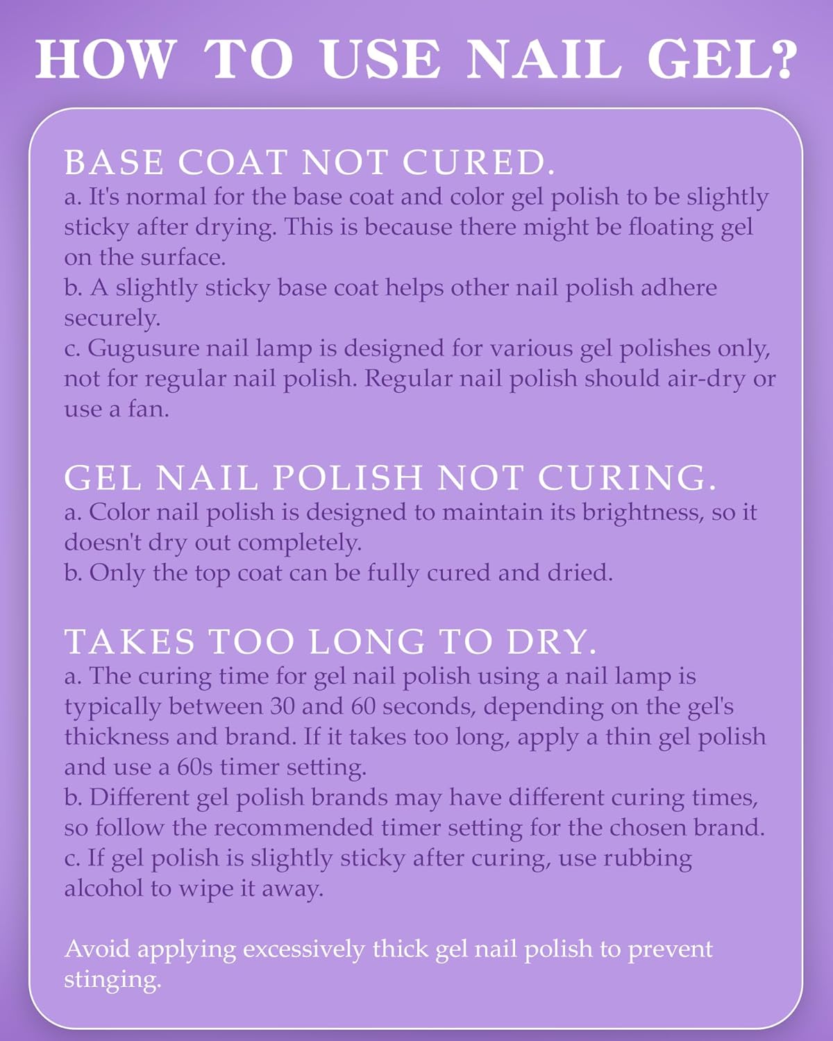 - [WIDE COMPATIBILITY] Gugusure Portable UV light for nails has a large hand compartment and a great light bead distribution for flawless, even, and fast curing of all five nails at a go. Fast curing with all your favorite nail gel brands from beginner to professional grades. You can use it for UV LED gels, hard gels, builder gels, sculpture gels and so on . Confirm the exact curing time of each of the nail polishes, bases, top coating, and gels on the product packaging.