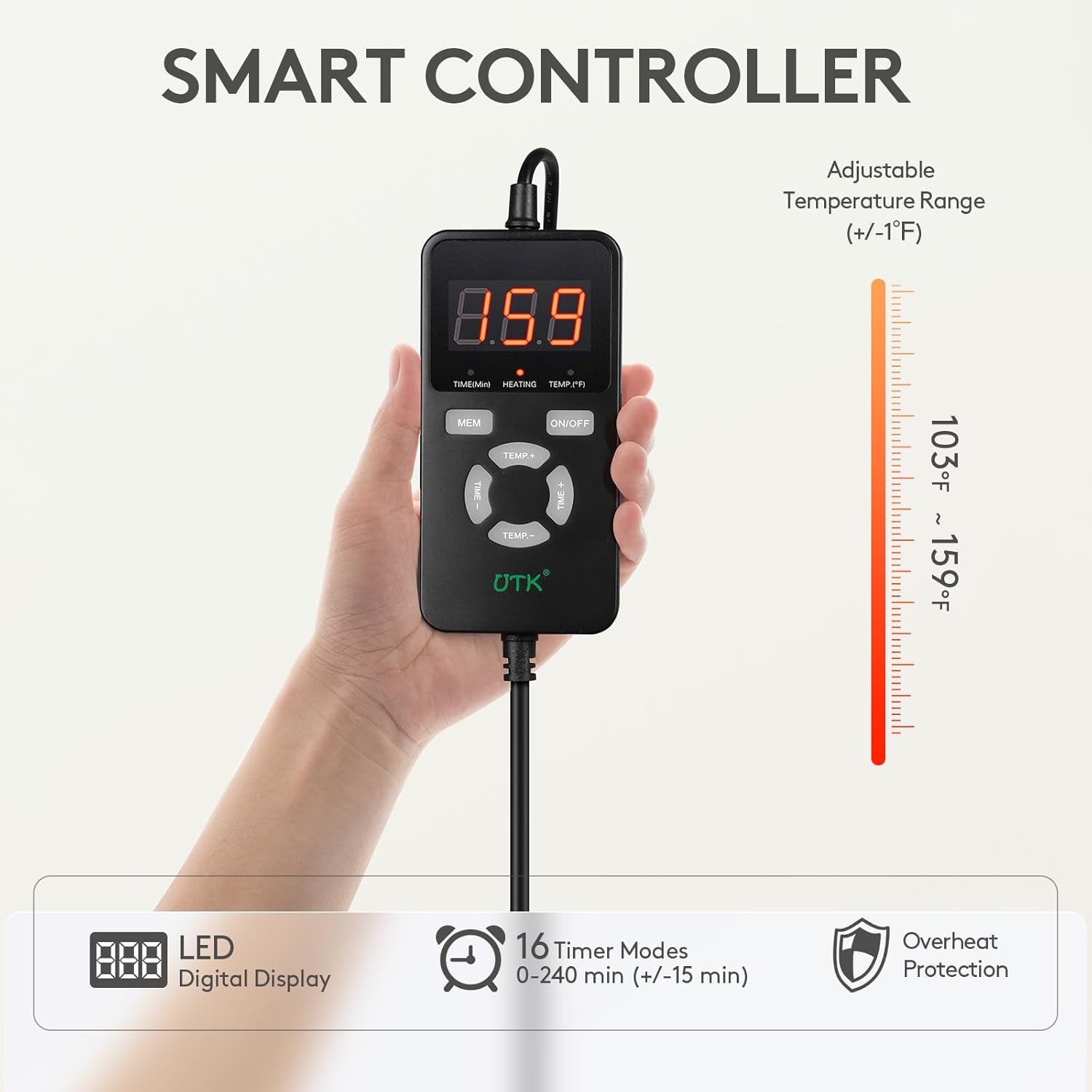 - 【Easy To Use】It uses a smart thermostat with a digital display. Multiple safety protections, one-button start and automatic memory functions are very friendly to the elderly. The design of multi-level temperature and time allows you to set your own exclusive heating mode more accurately. 57 temperature settings (+/- 1°F): 103-159°F. 24 time settings (+/- 15 min): 0-240 min