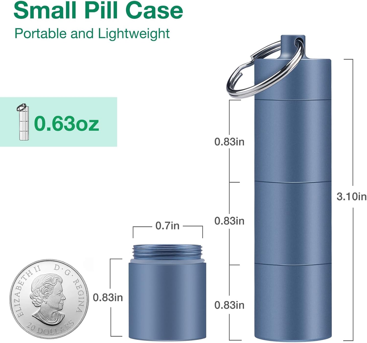 - 【Small & Lightweight】The external dimensions are 3.1" high and 0.7" in diameter. The weight of the pill box is only 1.27 oz (0.63 oz/pcs). Perfect for your travel purse, pocket, or attaching to your keychain for daily use