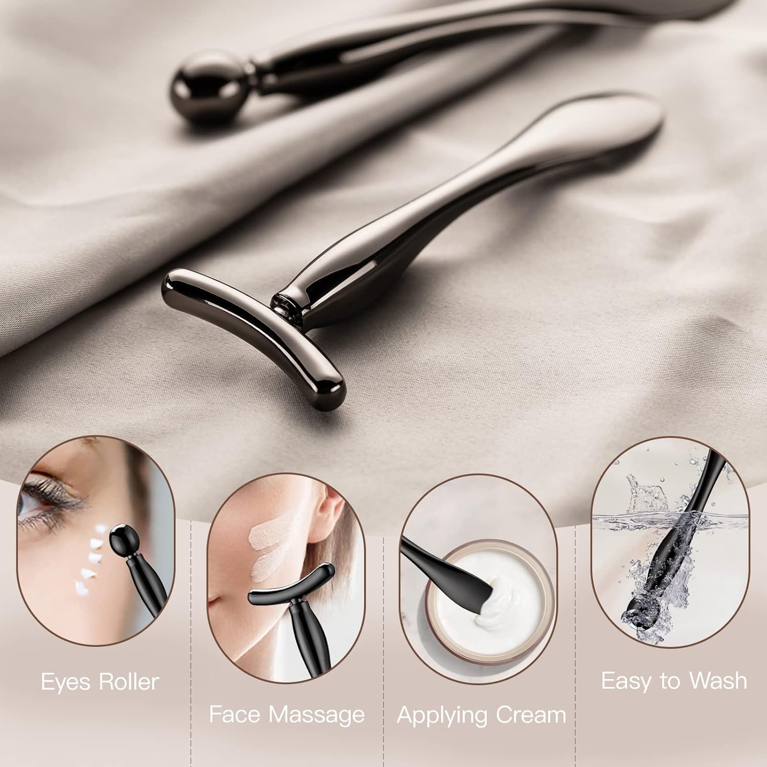 - 【CONTAIN】1 piece of round shape eye cream applicator, 1 piece of Y-shaped massage wand, and there are easy to clean and sterilize after using, you can put in our plastic storage box.
