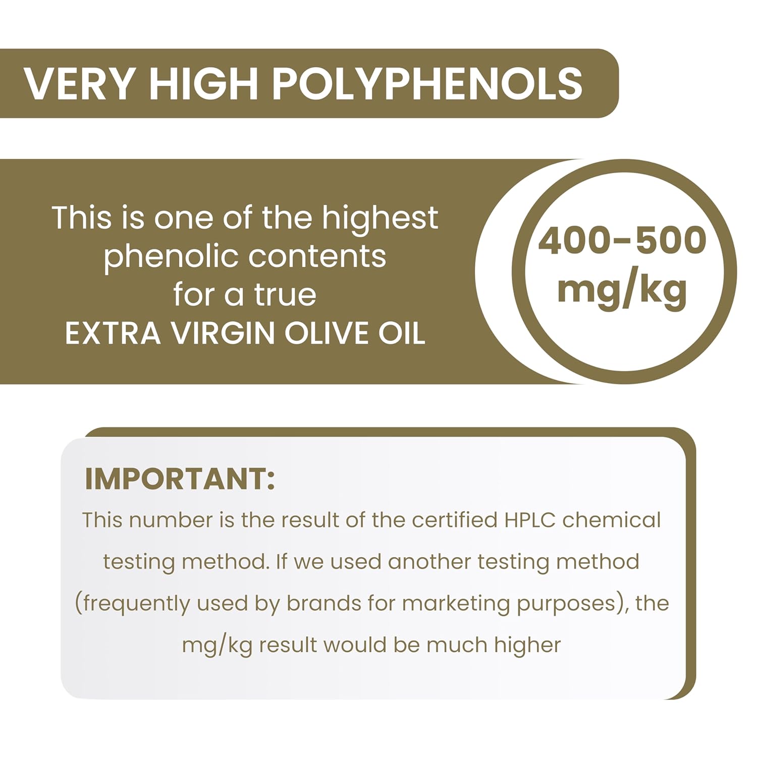 - Very High in Polyphenols – Rich in healthy Antioxidants, (450+ mg/kg Phenols during production) with high Hydroxytyrosol (and its derivatives) levels at over 6mg/20g. Attention! These numbers are the result of using the only certified chemical method by the International Olive Council called 'HPLC'. If we used other testing methods (not certified by the International Olive Council) the number result could be much higher.