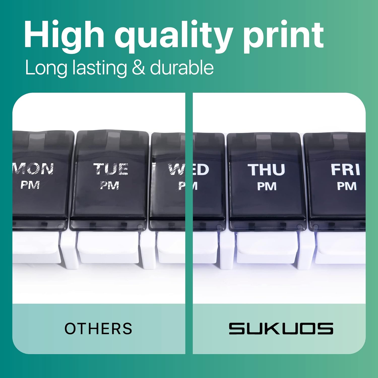 - Long-Lasting Printing: This 7-day AM PM pill organizer features bold marks for the week, making it simple to track your pills without needing to remember. The upgraded printing ensures that these marks remain durable, lasting up to 20,000 uses without showing any wear and tear.