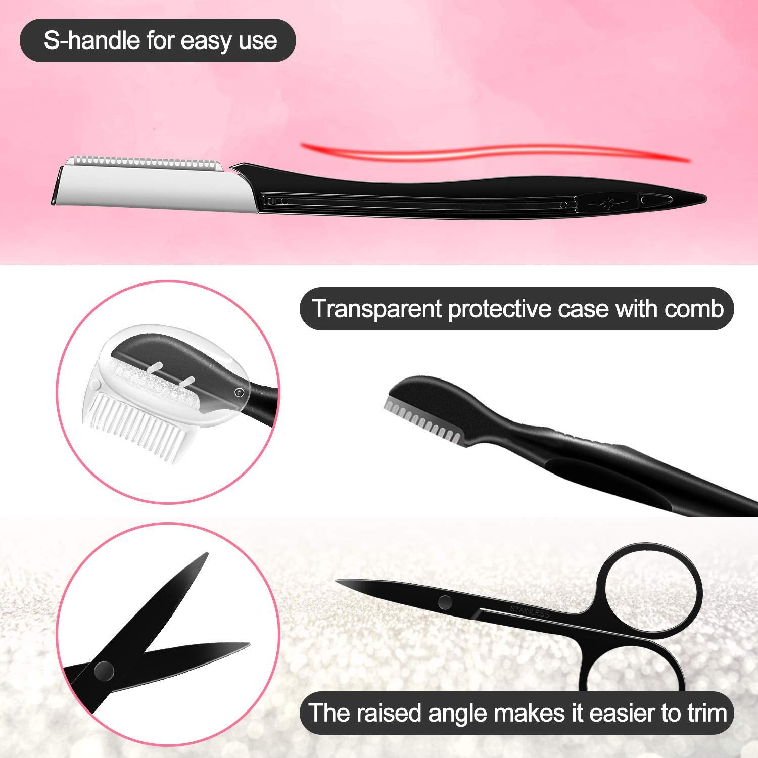 - 【Define and shape your eyebrows easily and safely!】 The pieces with sharp parts have guards on them to prevent you from cutting yourself. The scissors are slightly curved to isolate, lift and trim each hair with accuracy without hurting you.