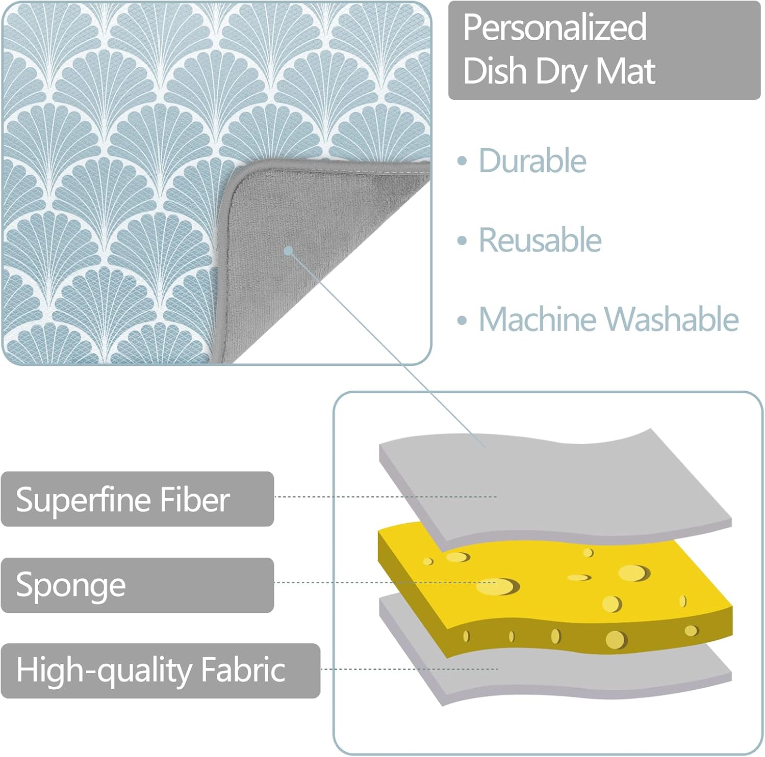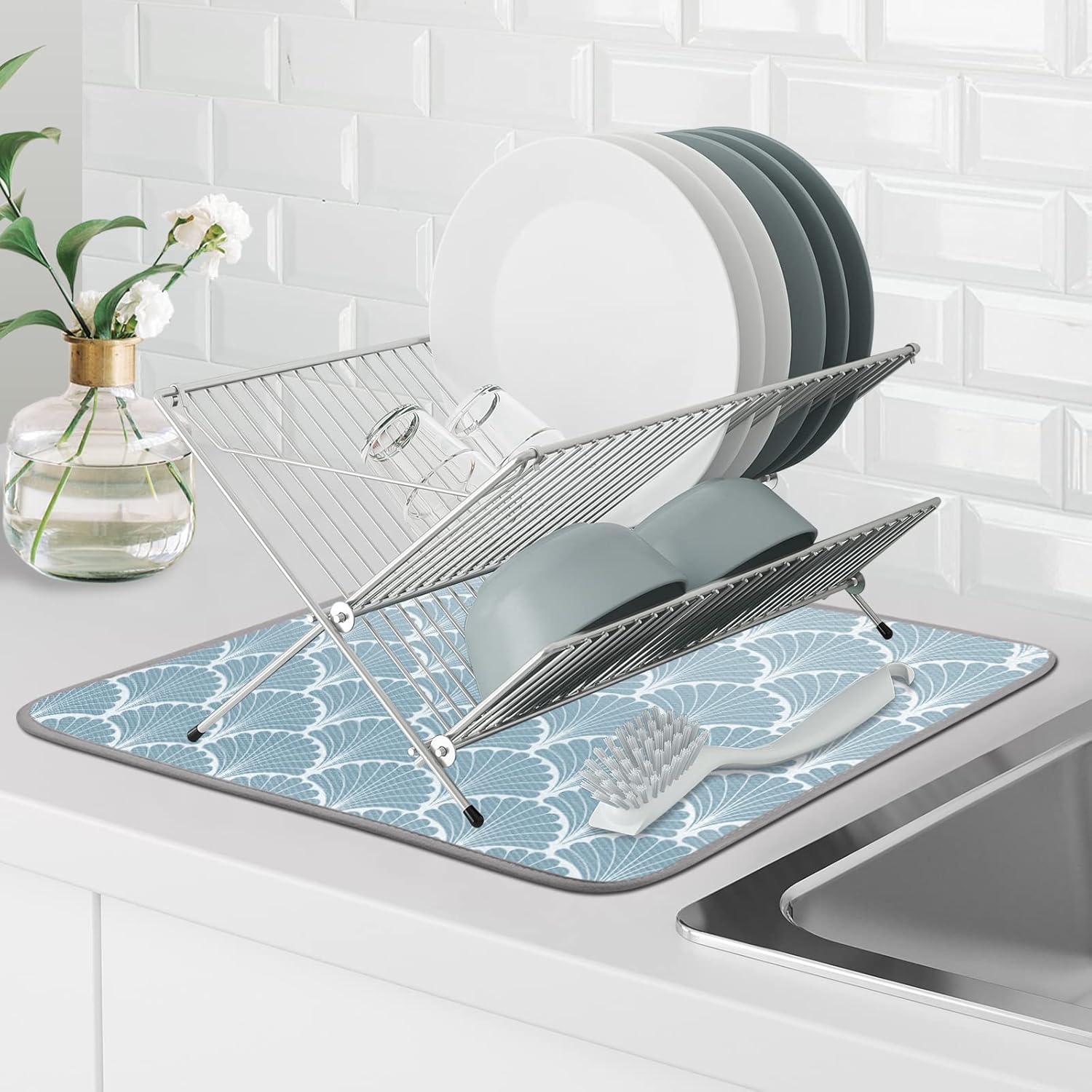 SHIYUE Dish Drying Mat for Kitchen Counter Super Absorbent Spring Kitchen Decor Microfiber Drying Matainers Rack Fast Pad Dish Drainer Mats(Aqua Blue Shell Geometric,16''x18'')