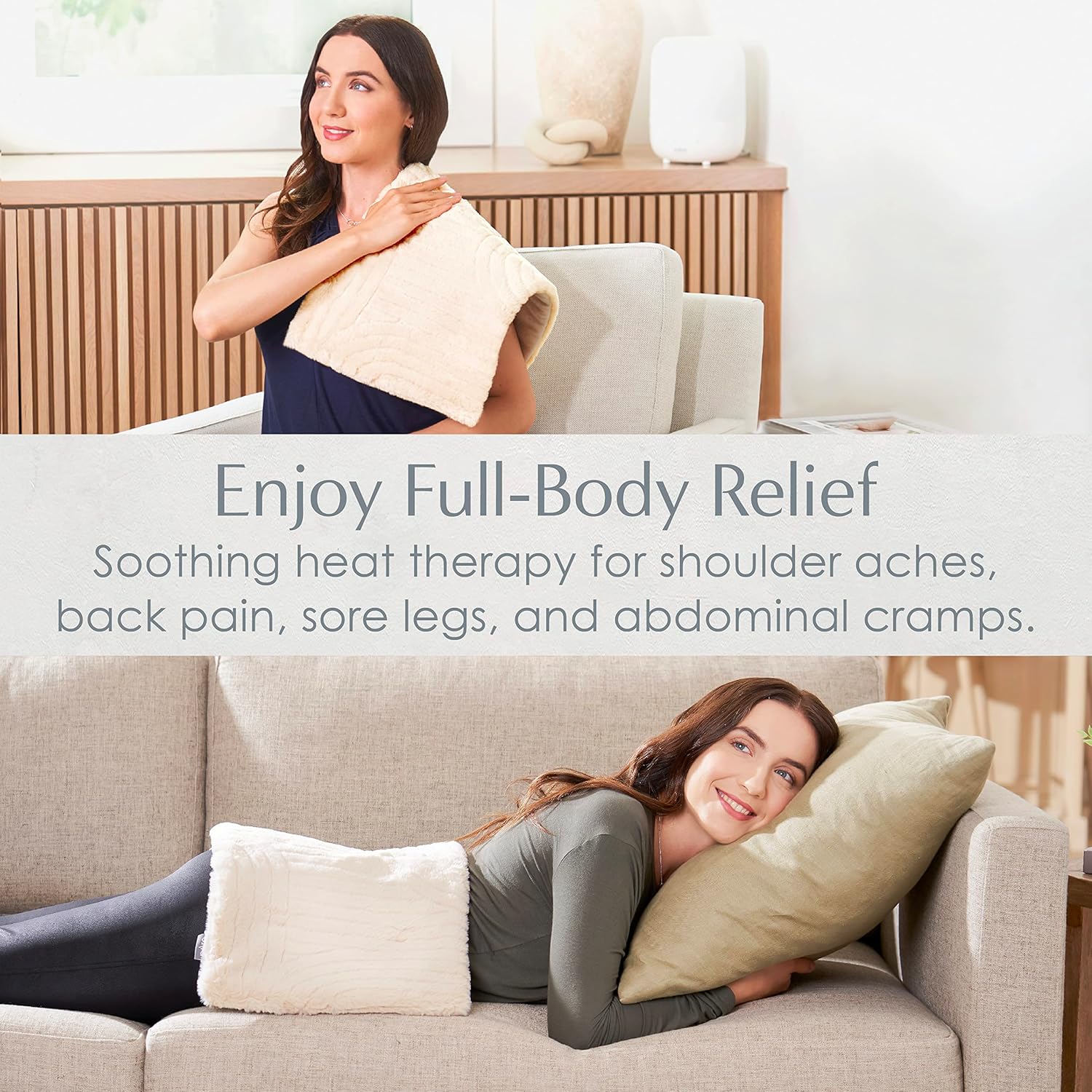 - FULL-BODY RELIEF: Enjoy targeted, soothing heat therapy to help temporarily relieve pain from menstrual cramps, muscle aches, arthritis pain, stiff joints, and sore muscles, plus help ease muscle tension in the back, neck, shoulders, abdomen, arms, thighs, legs, and other large muscle groups