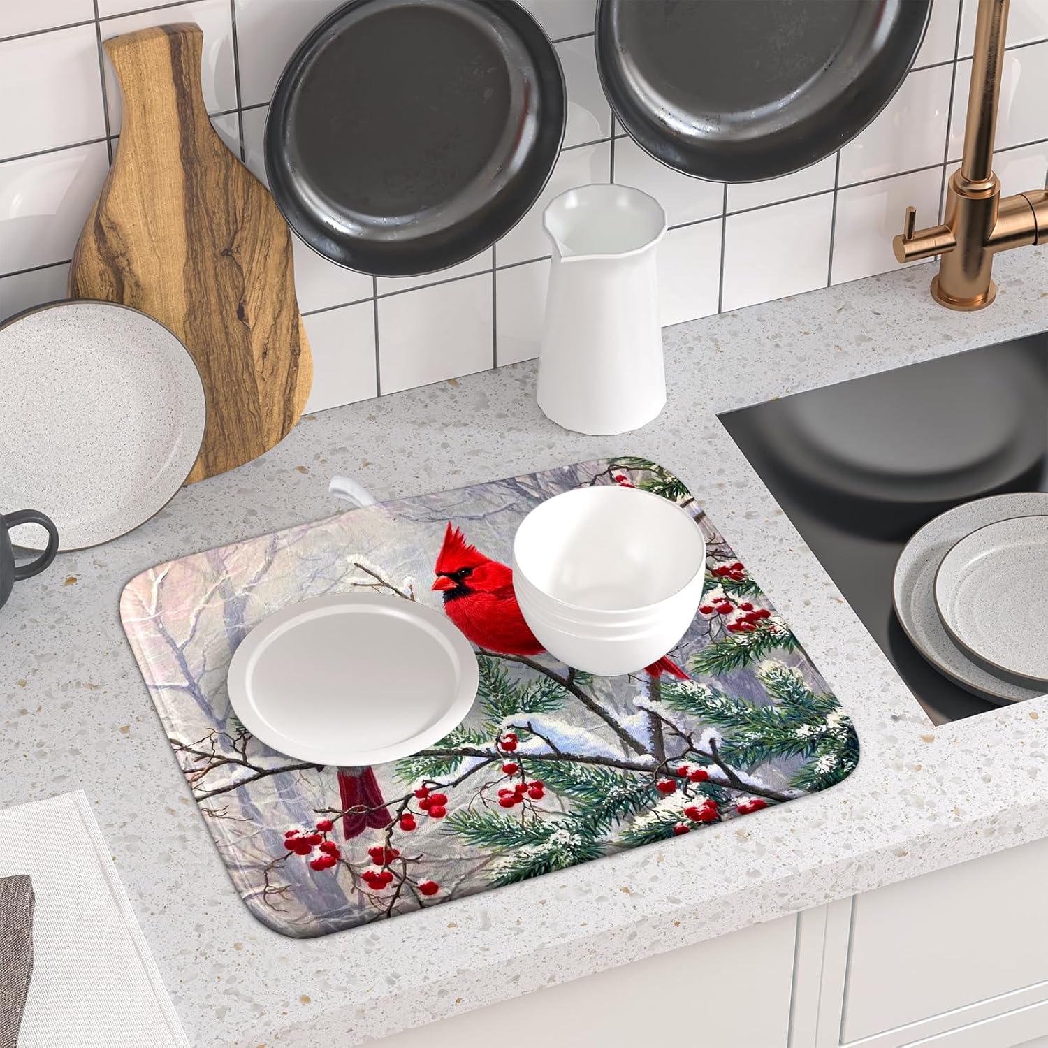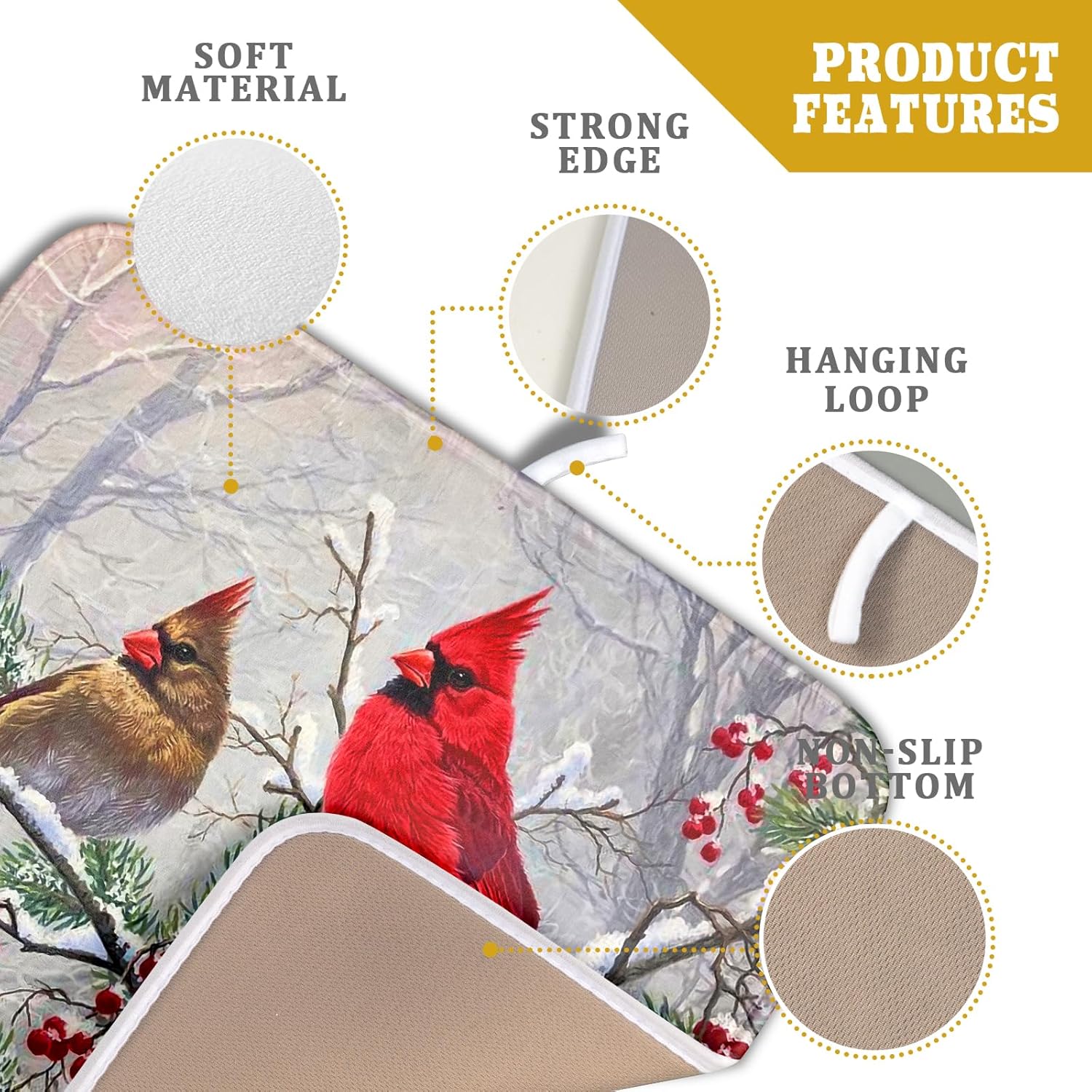 Red Bird Dish Drying Mat Merry Christmas Dishes Pad Absorbent Fast Dry Dish Drainer Mat Protector for Kitchen Counter 16 x 18 Inches