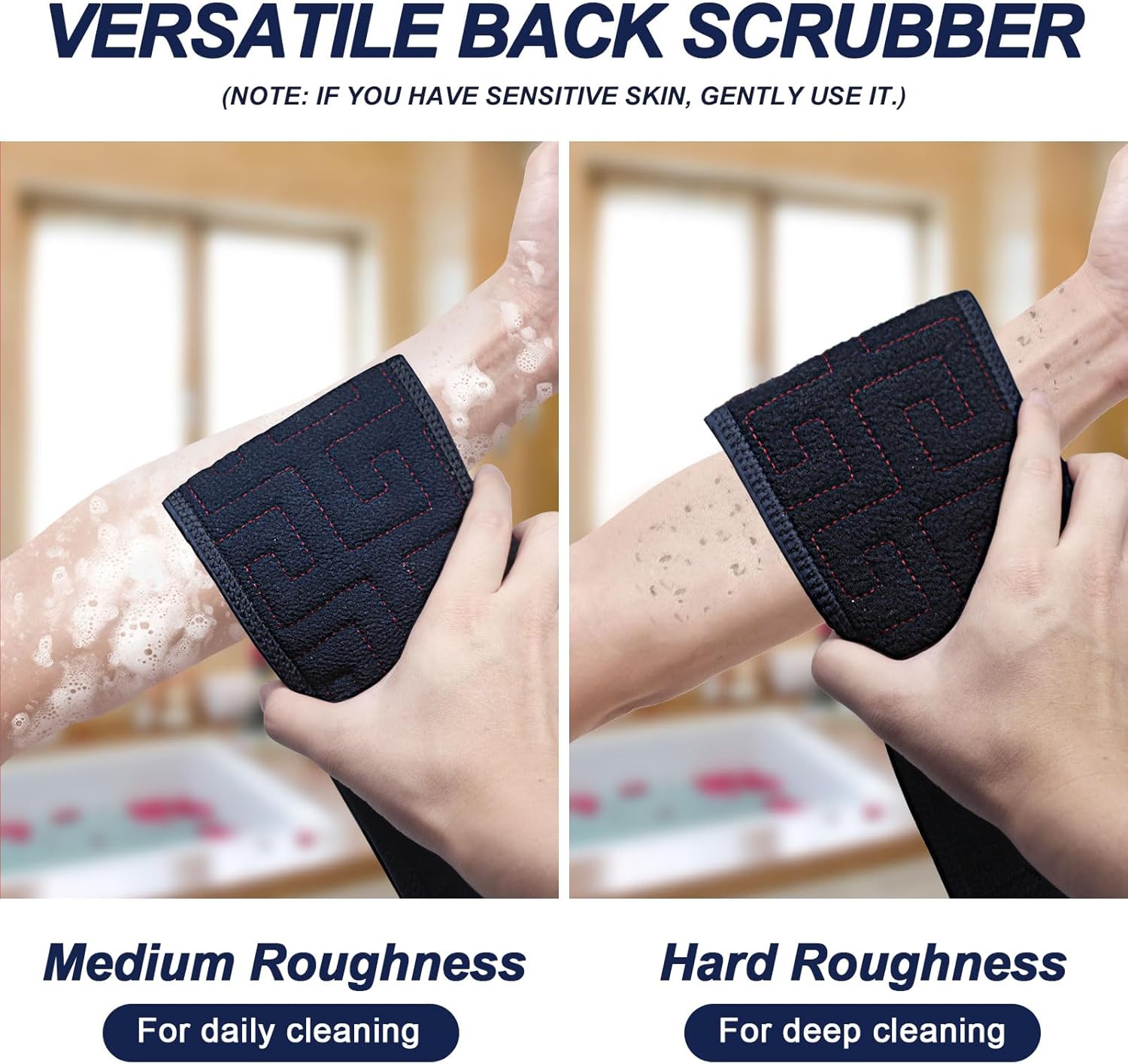 - VERSATILE BACK SCRUBBER - The double-sided concave and convex textured fabric is specially designed for the back skin. The medium roughness surface is used for daily cleaning, and the hard roughness surface is used for a deeper removal of dirt, dead skin, and so on. Make your back skin more smooth.