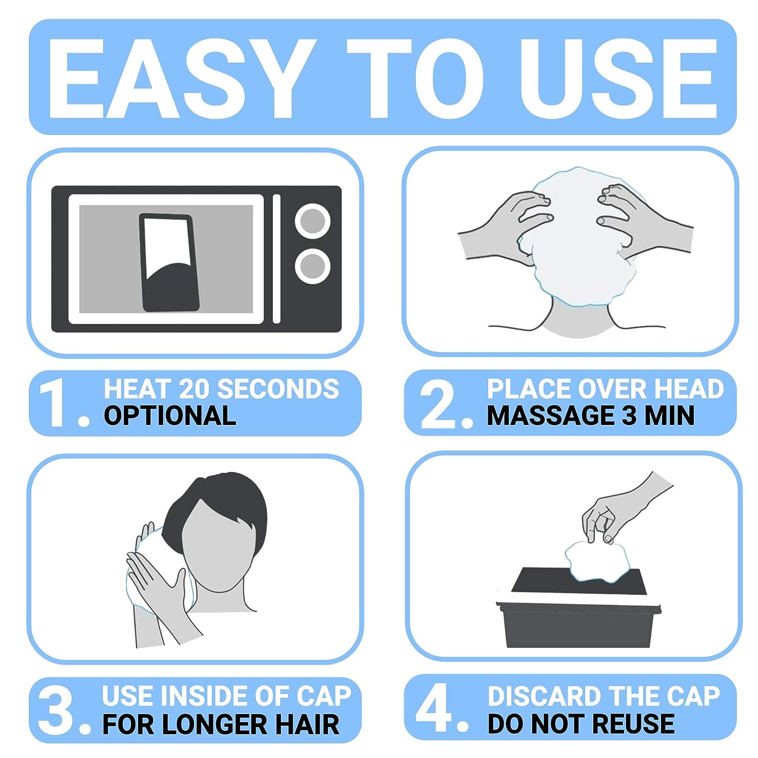 - WATERLESS & EASY TO USE: The shampoo caps no rinse microwavable can be placed in the microwave for 20 seconds if you want to use it warm, or straight from the bag cold. The caps have an elastic band at the bottom to stop dripping