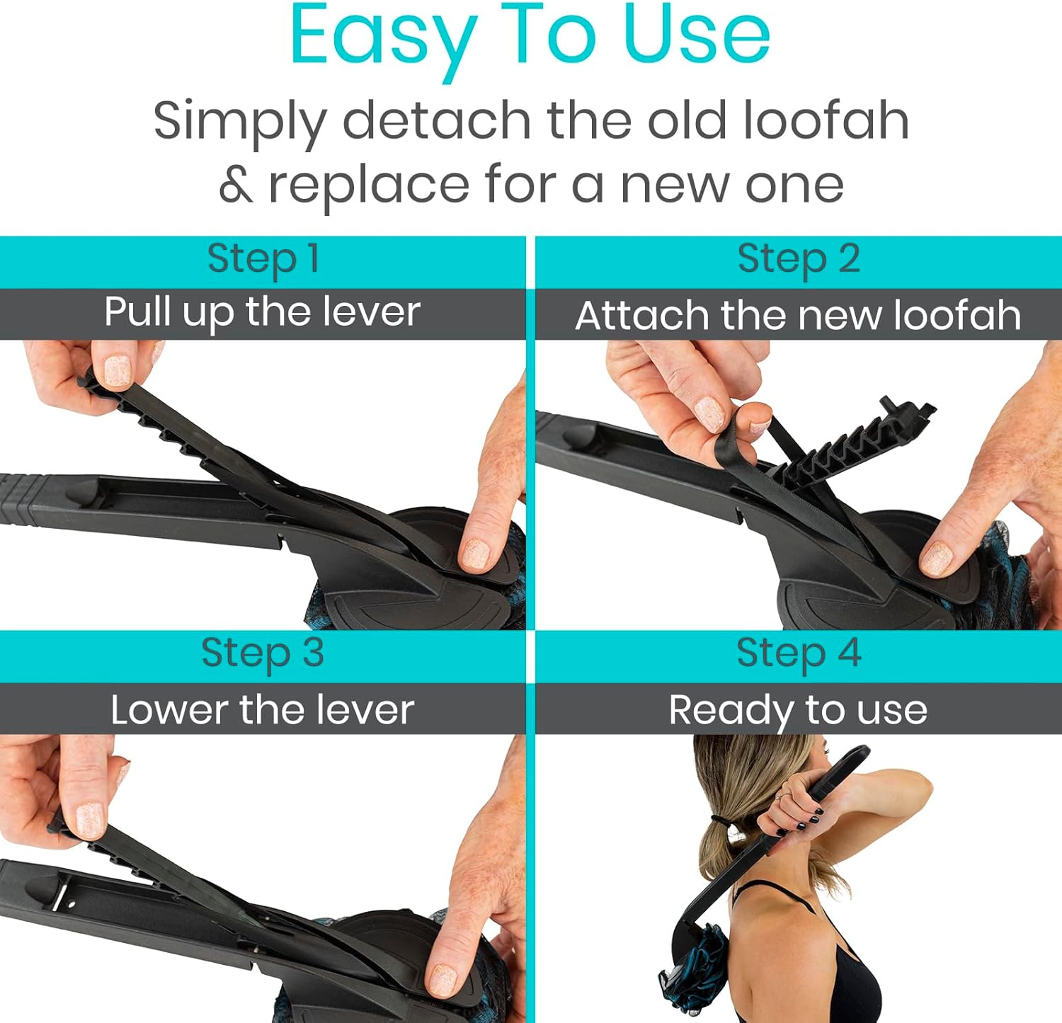 - CLEAN HARD-TO-REACH AREAS: Avoid dangerous bending, twisting, and straining while in the shower or bath. The Vive Interchangeable Loofah Handle allows you to use any loofah with greater ease. Target hard-to-reach areas like the back, shoulders, and neck with this extended reach handle for a more thorough cleaning.